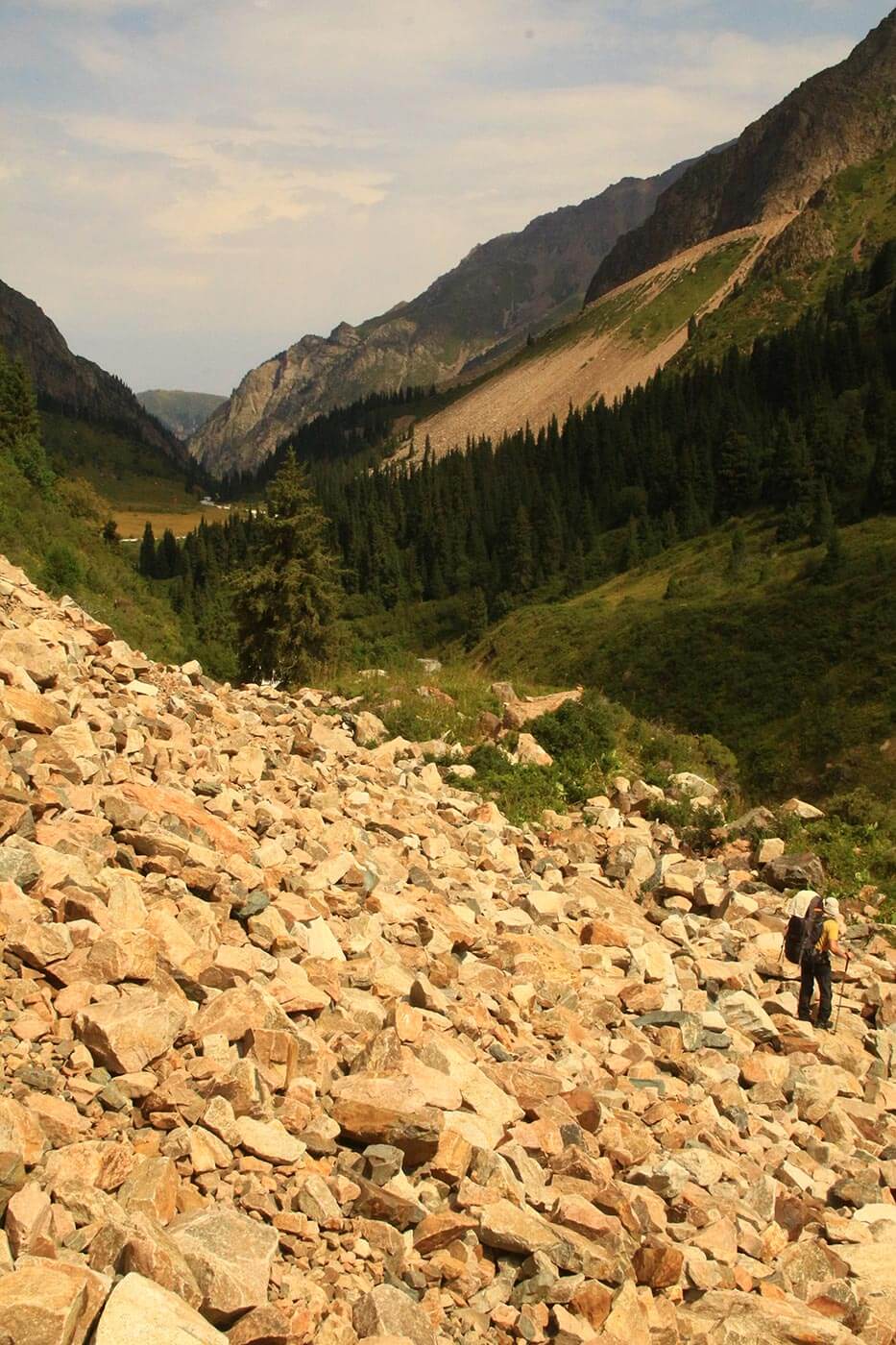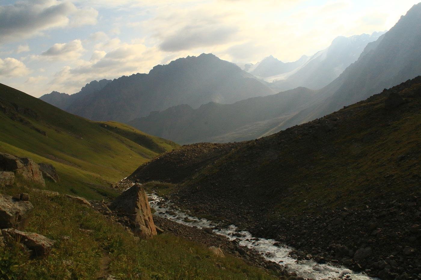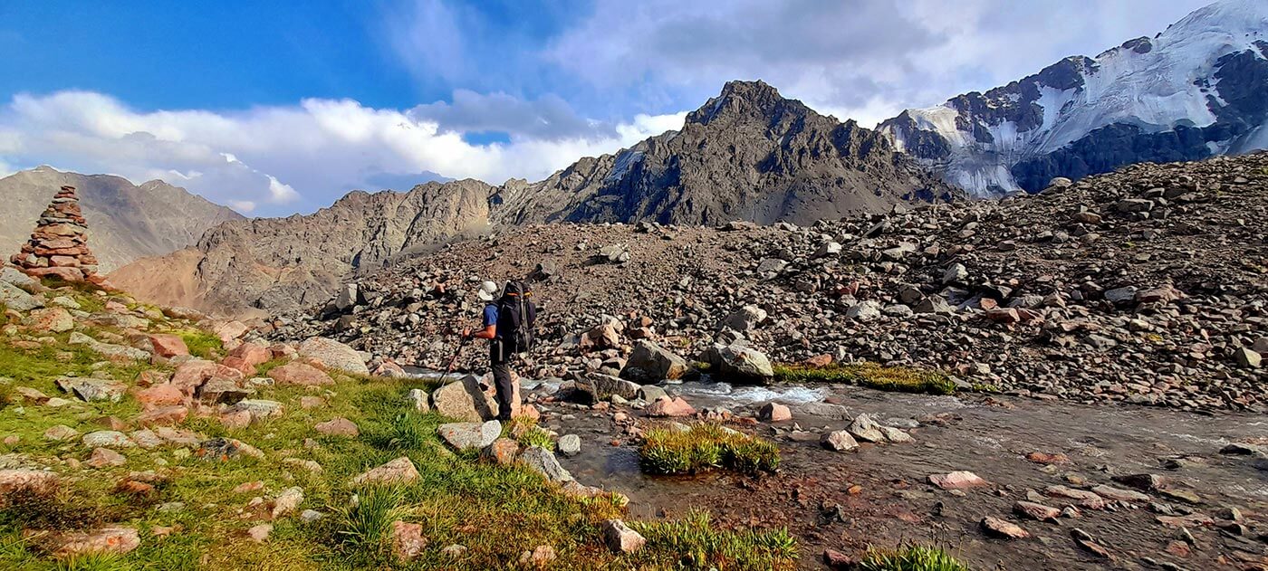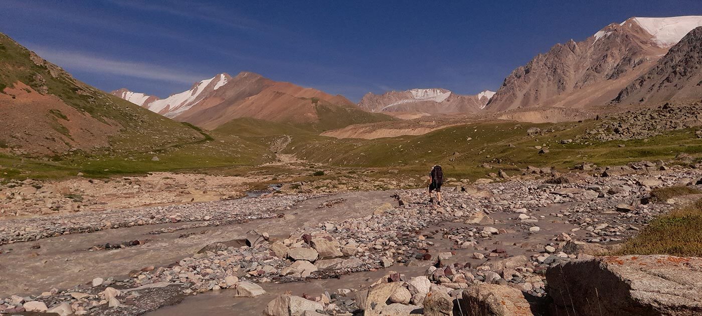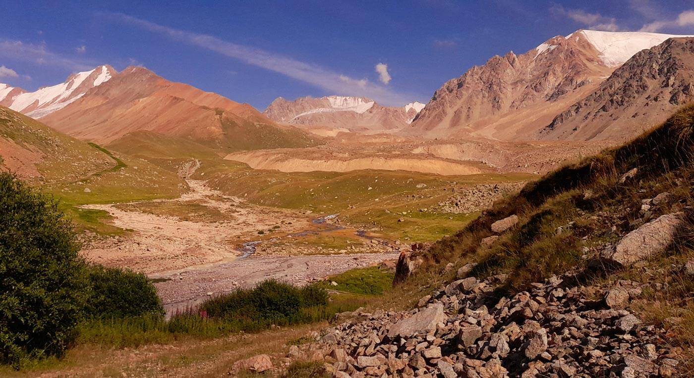Reggel – egy frissítő patakátkelés kíséretében – elhagyjuk a Nagy Almati folyót, és a Kizil-say mentén gyalogolunk egyre feljebb. Egy idő után a havasi rét is kikopik talpunk alól, és végmorénák kőrengetegében araszolunk egyre feljebb a 3981 m magas hágó felé.