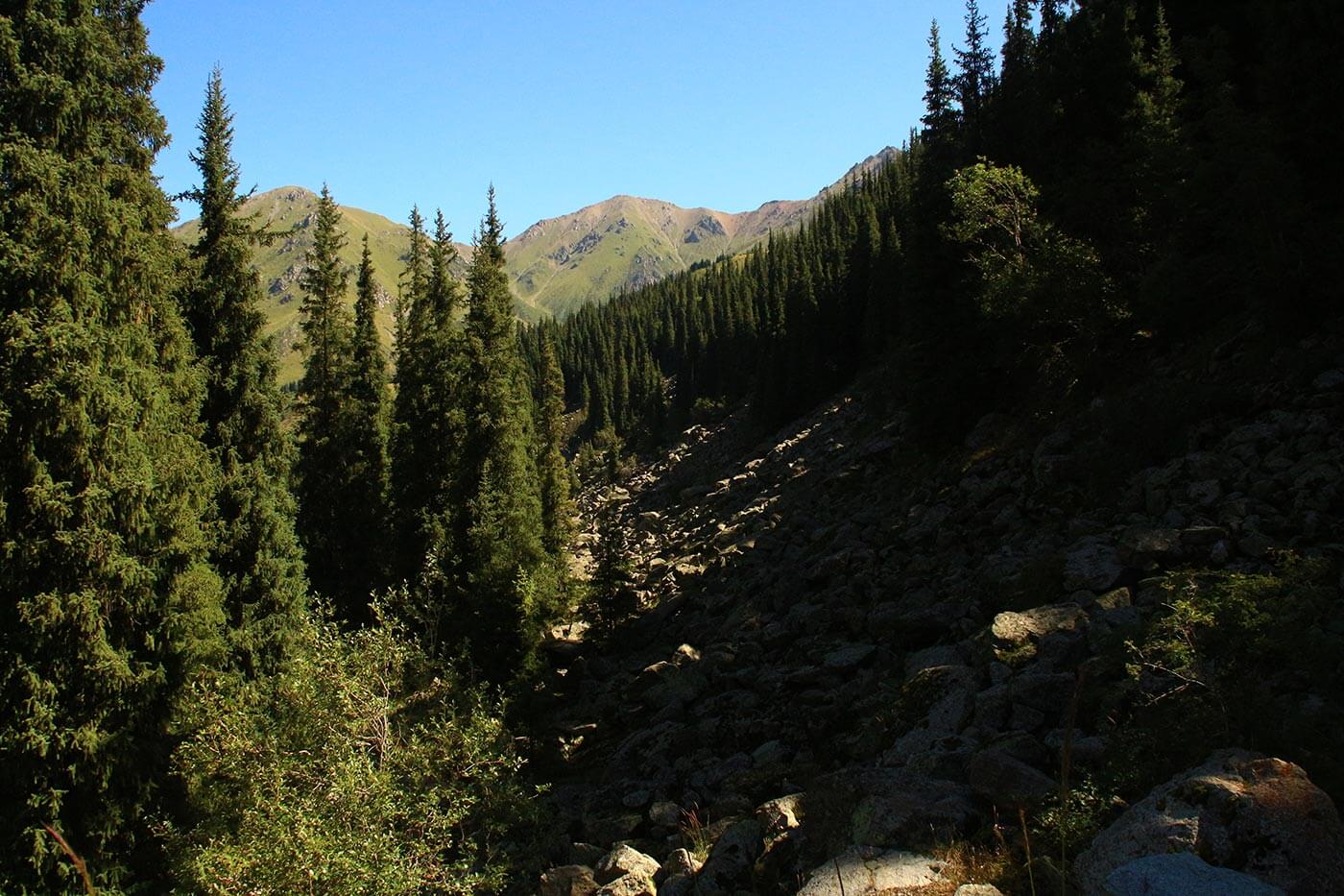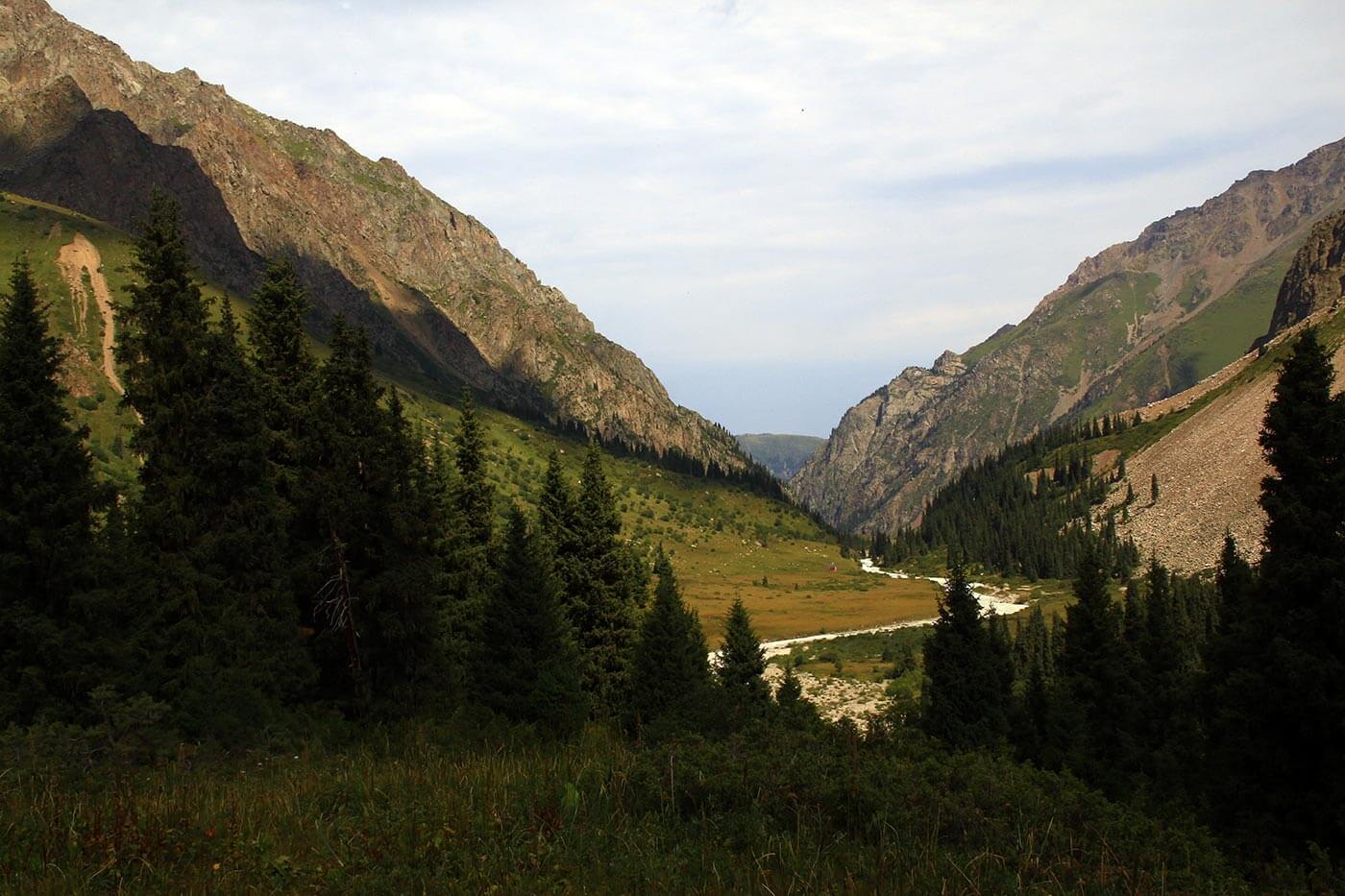 Reggel lebontjuk sátrainkat, és követve a Bal-Talgar folyását igencsak változatos tájat szelünk át: alattunk a Talgar kanyarog, hol virágzó réteket, hol fenyveseket szel át, hol zúgó, sziklás szurdokba kényszerül. Kisebb-nagyobb oldalvizeken átgázolva haladunk egyre lejjebb a folyóvölgyön, miközben alattunk a bömbölő folyó hatalmas köveket görget. És mi csak gyönyörködünk a változatos hegyvidéken, melyet minden irányból havas csúcsok kereteznek.