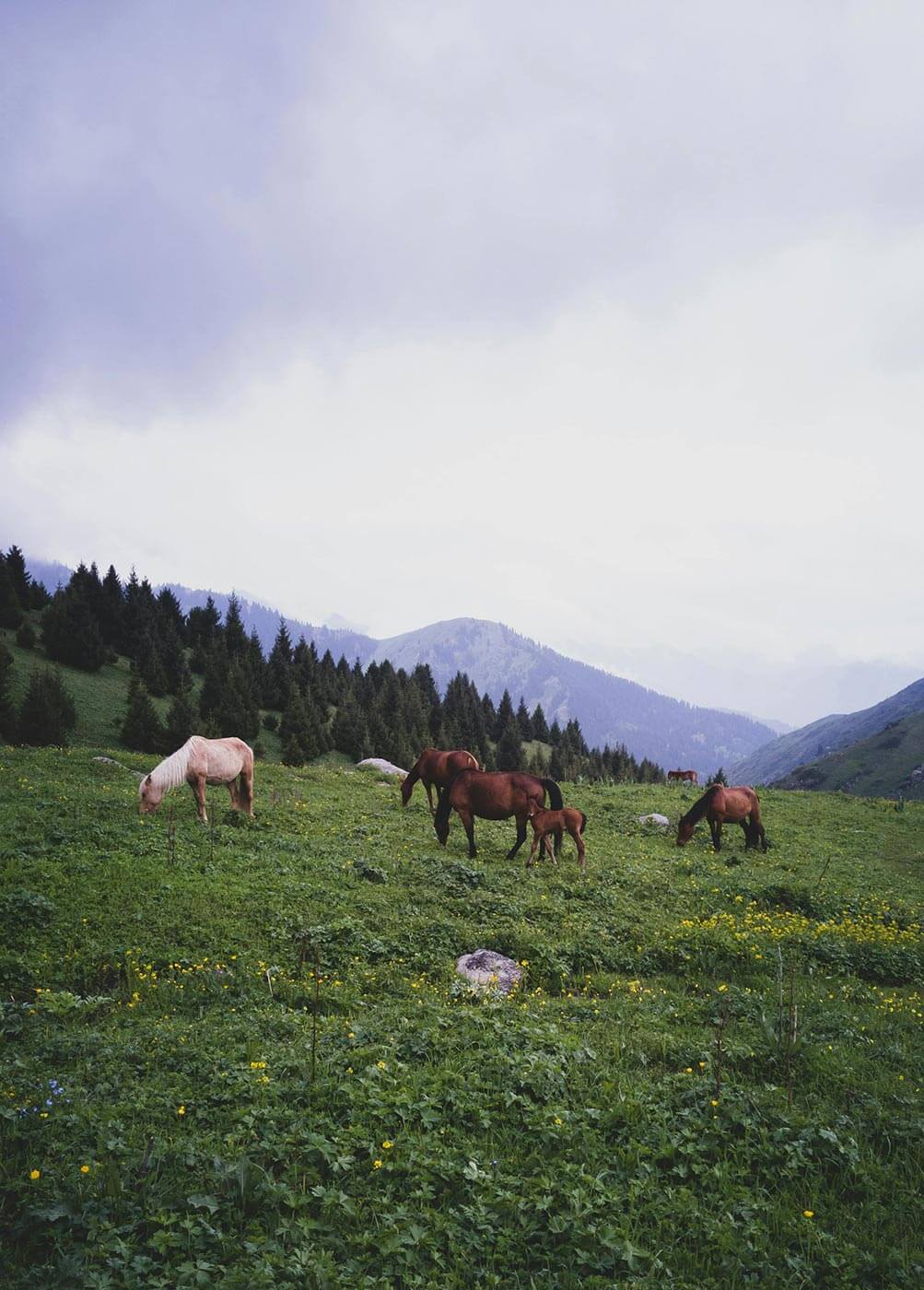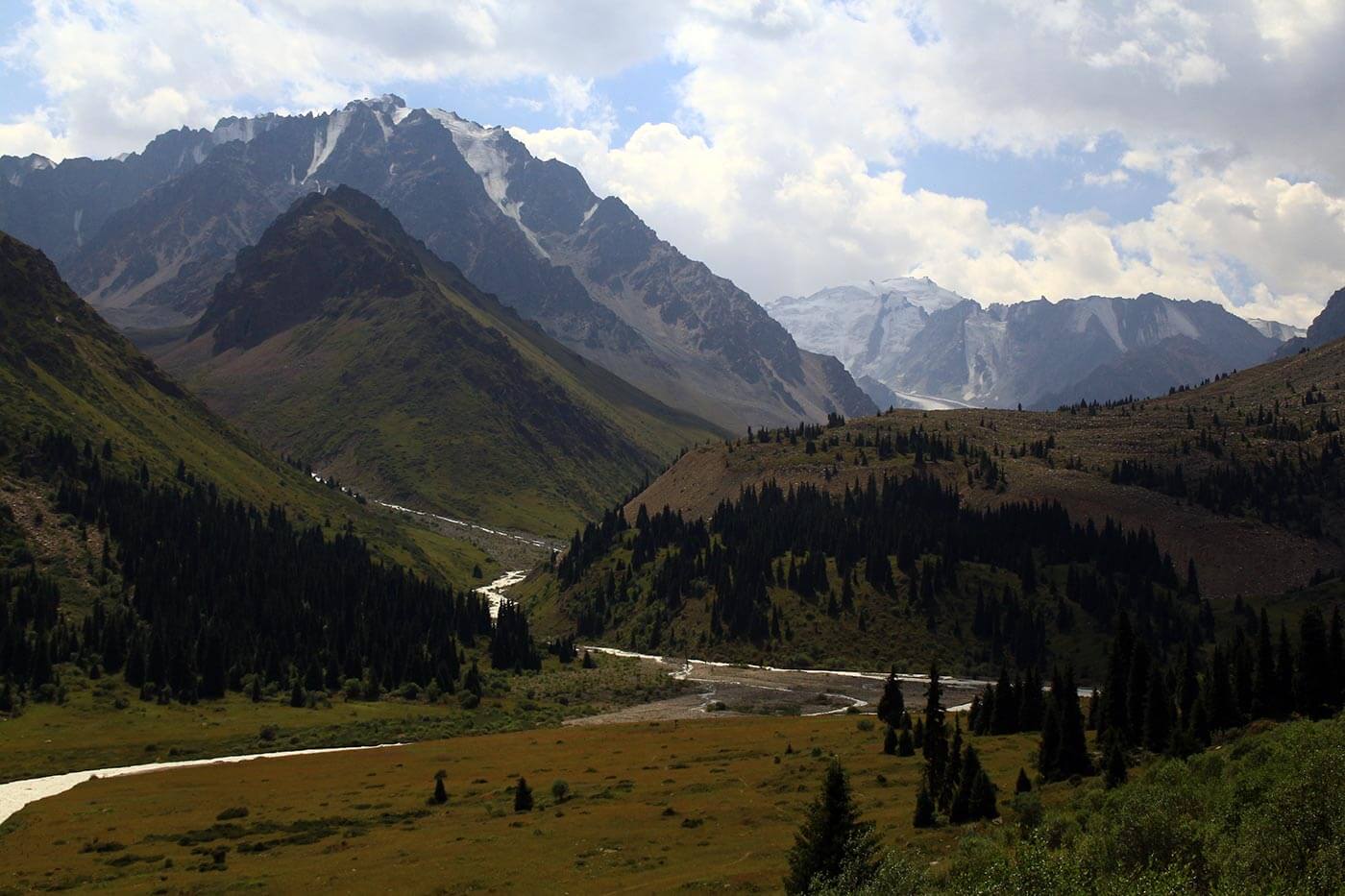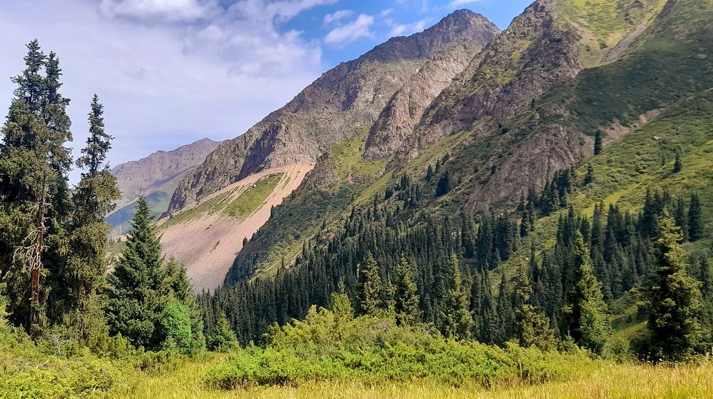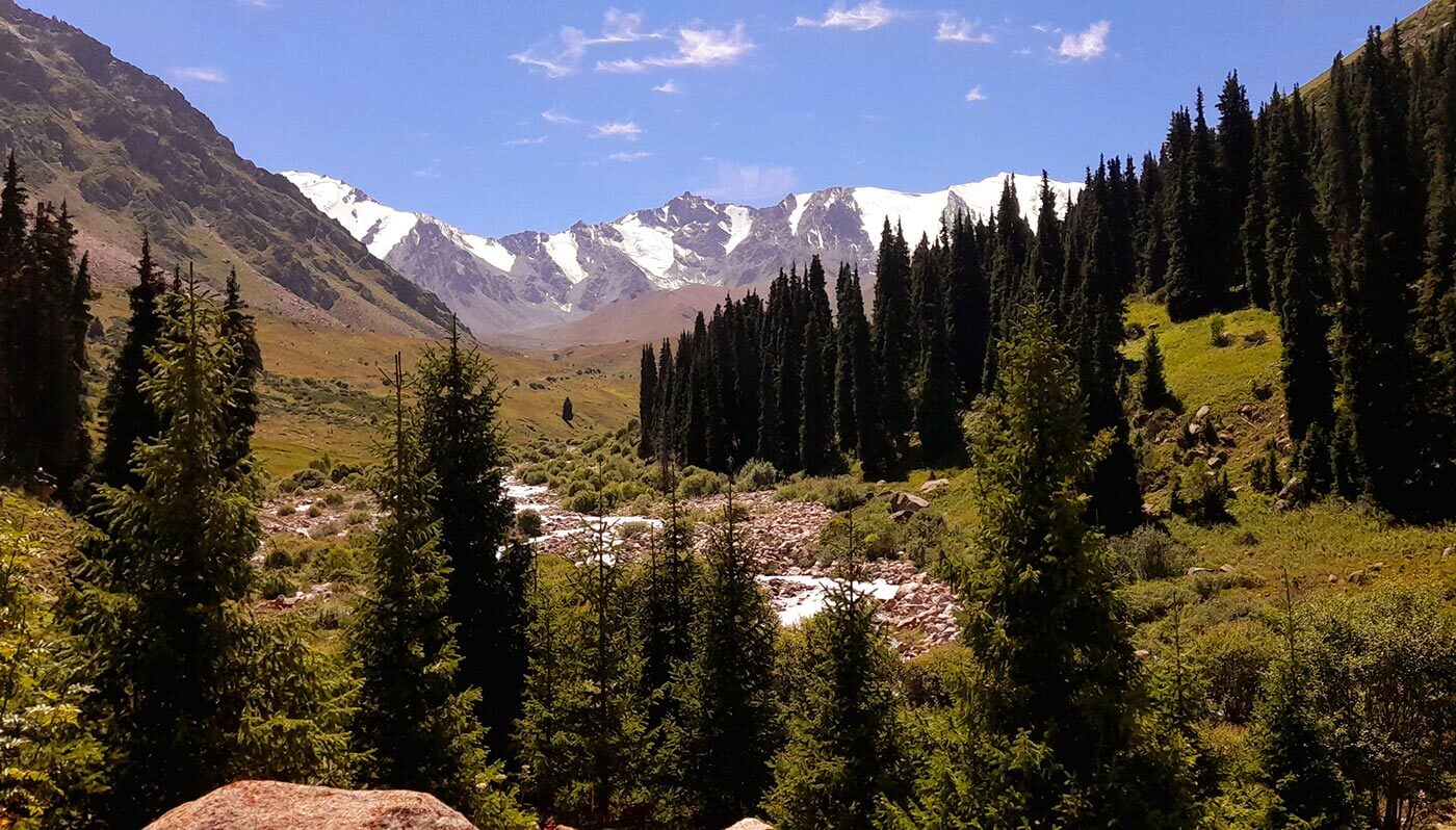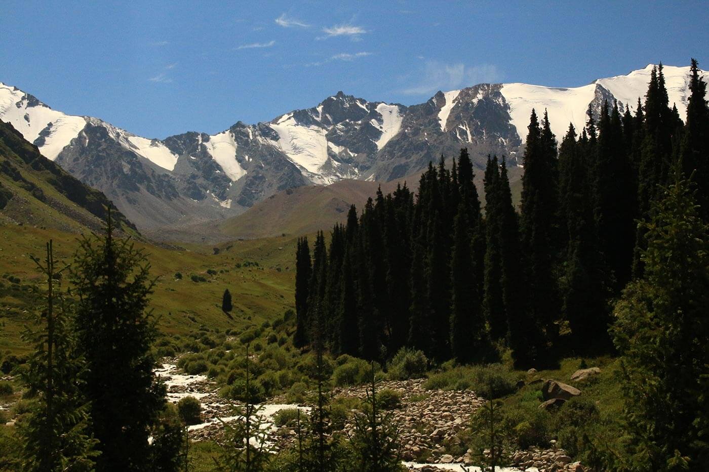 Az Ala Tau hegyei között gyönyörű fenyvesekkel, alpesi rétekkel, zúgó hegyipatakokkal és havas csúcsokkal találkozunk, míg az ország jelentős része sztyeppe, néhol sivatag.