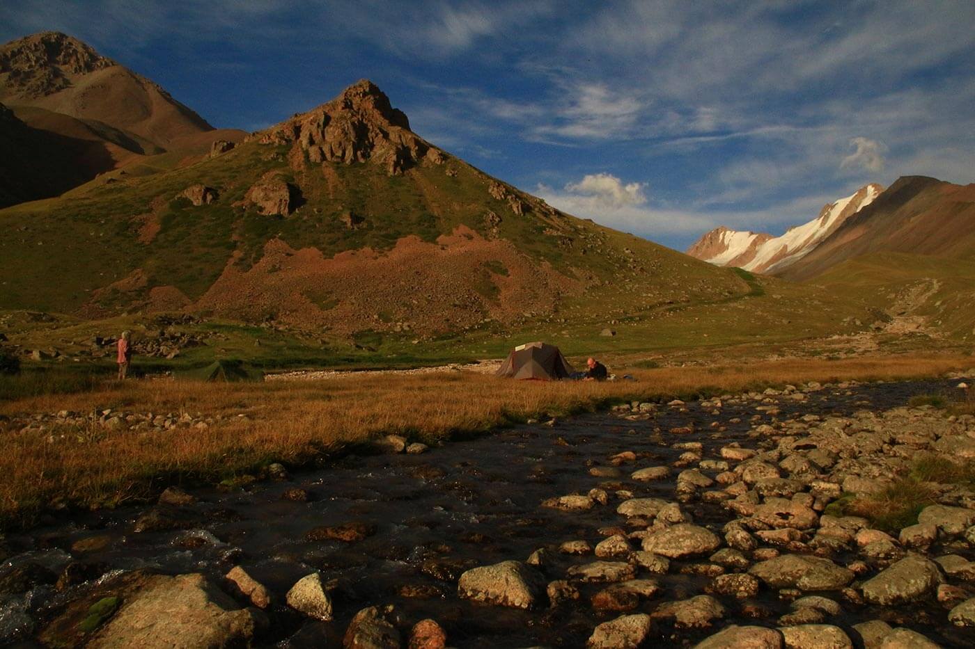 A délutáni órákban foglaljuk el sátorhelyünket egy esőbeálókkal kiépített táborhelyen, egy csobogó hegyipatak partján.