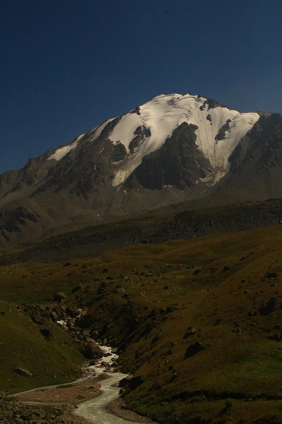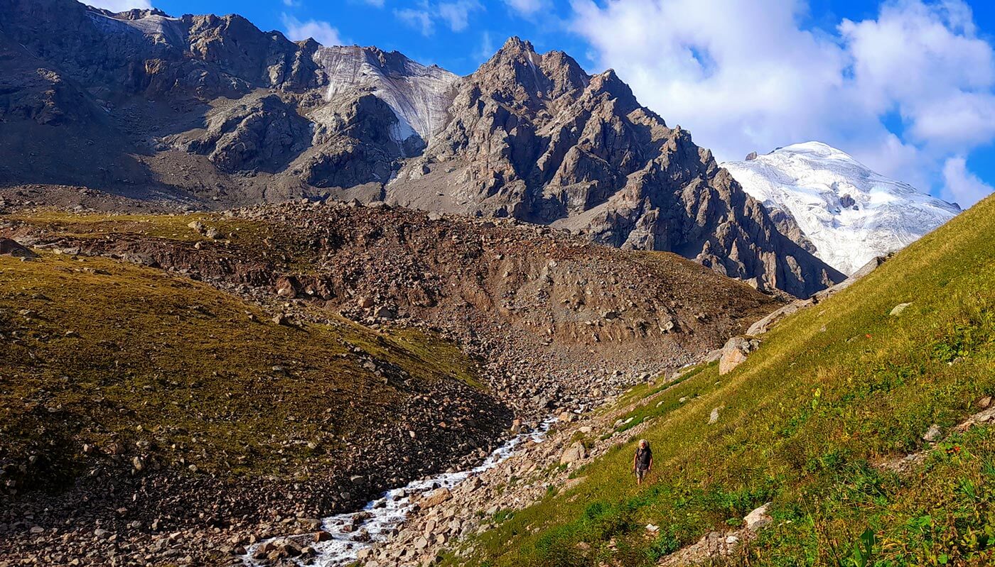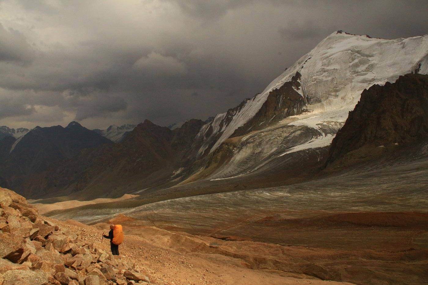 A hágón megpihenünk és élvezzük a gyönyörű kilátást: alattunk a Talgar völgye, fölötte a Talgar-csoport közel ötezres, jeges csúcsai emelkednek az ég felé. A völgyben a végtelen hosszan elnyúló végmoréna, melyen mi is egész délután araszolni fogunk lefelé.
