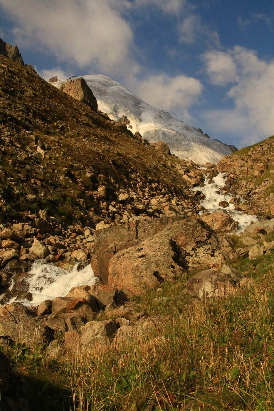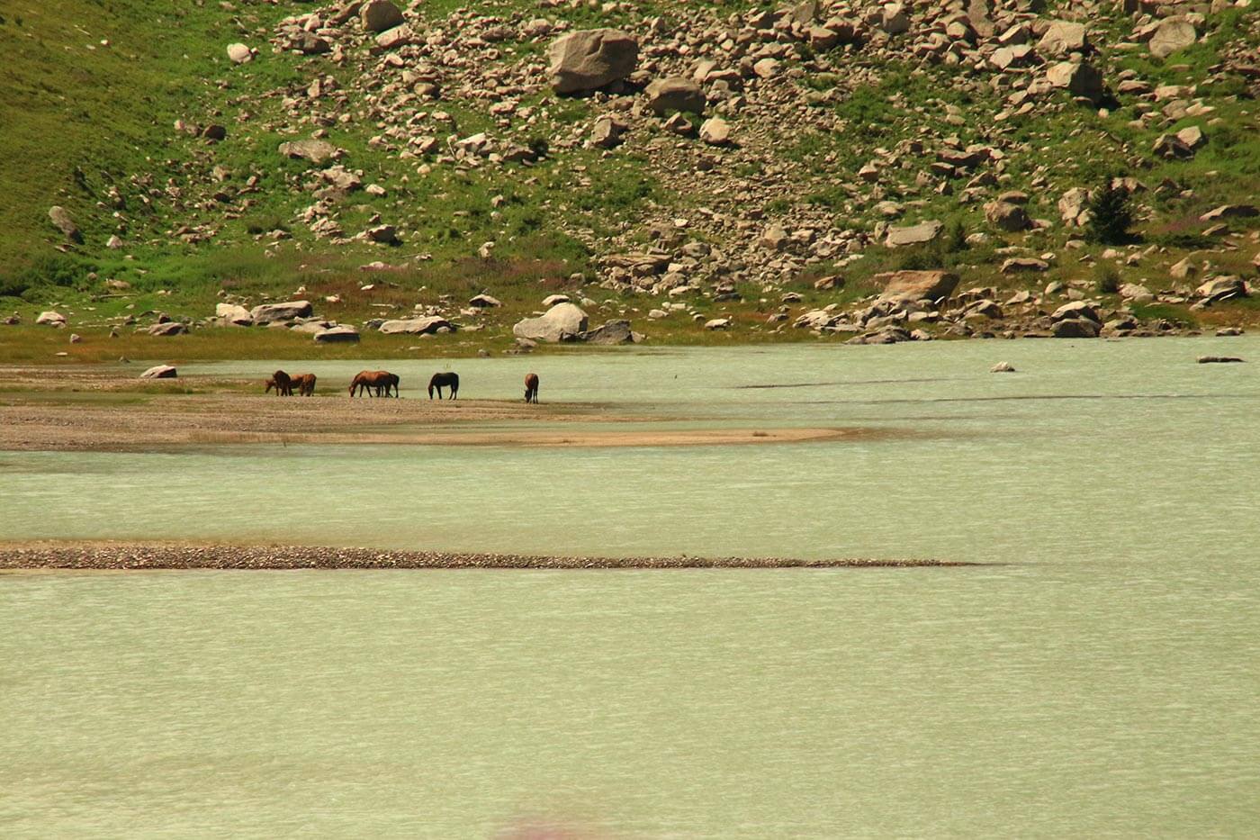Itt már jellemzően elkopnak a turisták, és a sudár, méregzöld fenyvesek közt már igazi magashegyi magányban élvezzük a havas csúcsok látványát. A fenyveseket elhagyva kiérünk a virágzó havasi rétekre, ahol az ösvény a folyó partján kanyarog egyre feljebb. A délutáni órákban még vár ránk egy utolsó kihívás: át kell kelnünk a jéghideg folyón, hogy megérkezzünk táborhelyünkre, egy kristálytiszta patak viszonylag lapos partjára.