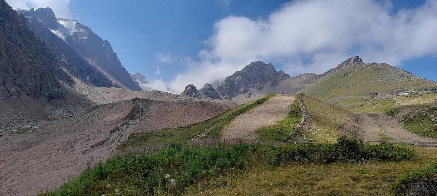 Reggel egyből egy kemény emelkedővel kezdünk – mellyel nagyjából el is megy a délelőtt. 1000 méter szintet legyőzve lassan kikapaszkodunk a Talgar szurdokából, és újra a jeges csúcsok alatt, a havasi réteken gázolunk. A Kis-Talgar csúcsról megcsodálva az 1200 méter mély kanyonra nyíló kilátást elindulunk a mormotafüttyös réteken keresztül Shymbulak síközpont felé. Az elmúlt években felépített modern sípályák felvonója egészen a hegytetőre vezet – ami most nagy szerencsékre levisz minket a völgybe, megspórolva egy végtelen hosszú és meredek lefelé gyaloglást.