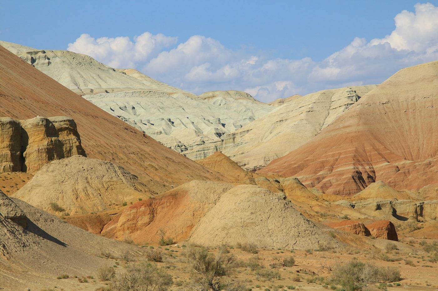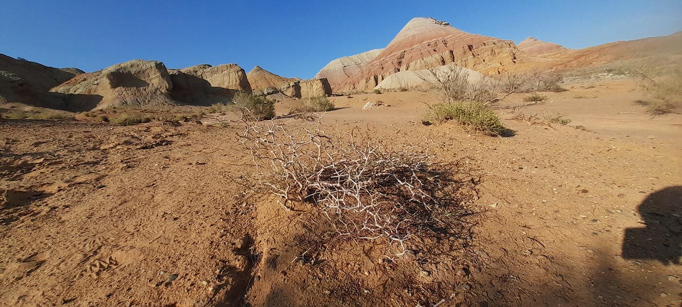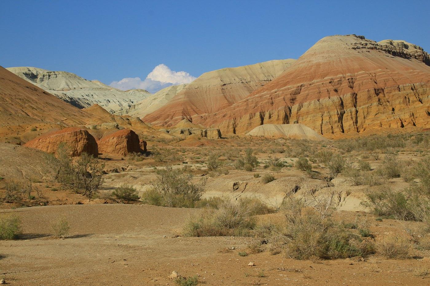 Reggel korán kelünk, hiszen egy hosszabb autóút vár ránk. Elhagyjuk a Tien-san buja zöld hegyvidékét, és újra a végtelen sztyeppén utazunk. Egy idő után a sztyeppe is kifogy a kerekek alól, és megérkezünk az Altyn-Emel Nemzeti Park sivatagjába. A délutáni órákban teszünk egy túrát az Ak-Tau kopár sziklavilágába: egy mélyre vágódott kanyon mentén túrázunk egyet a kietlen, színes sziklavilágba. A túra alatt megrakjuk zsebeinket a sivatag rózsájával, azaz gyönyörű gipszkristályokkal, melyek a lábunk előtt hevernek a kiégett talajon.