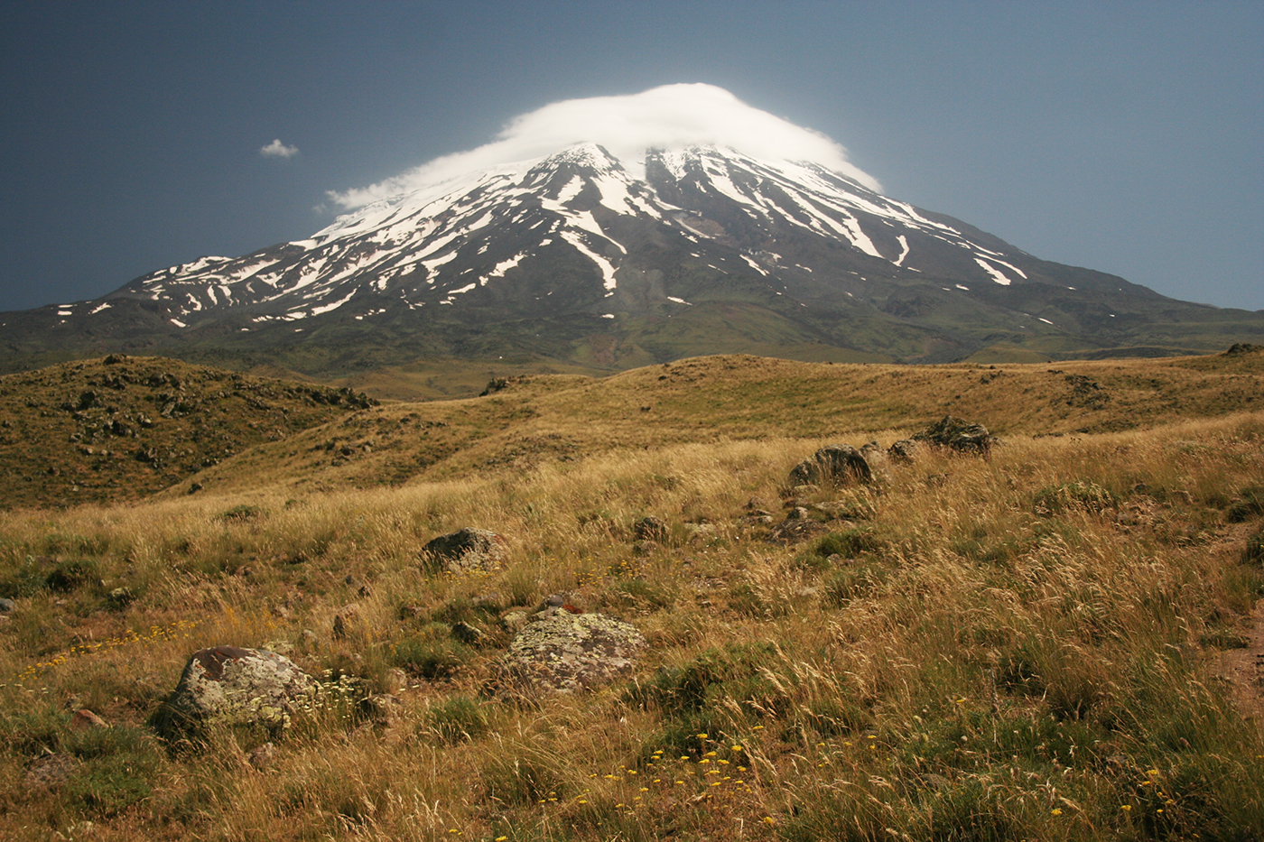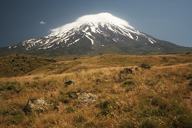 És ott van az Örmény-felföld négyezer méteres havas csúcsokkal koronázott hegyvidéke, ahol az ősi Urartu várai fölött az Ararát szent hegyének fehér hósapkás, ötezres csúcsa trónol.