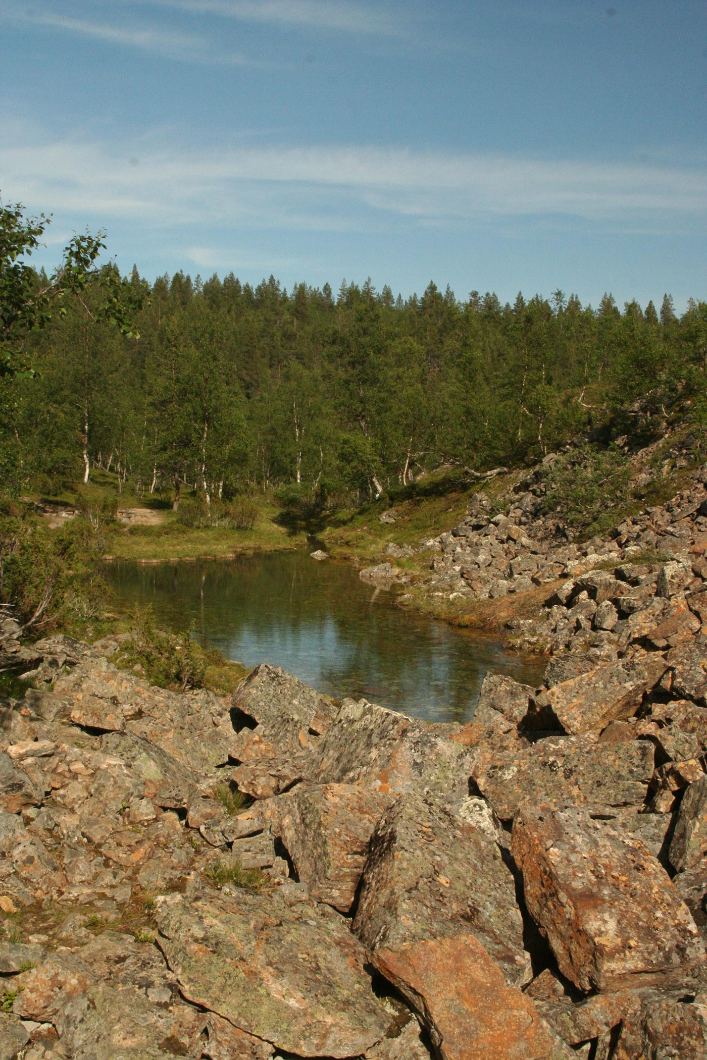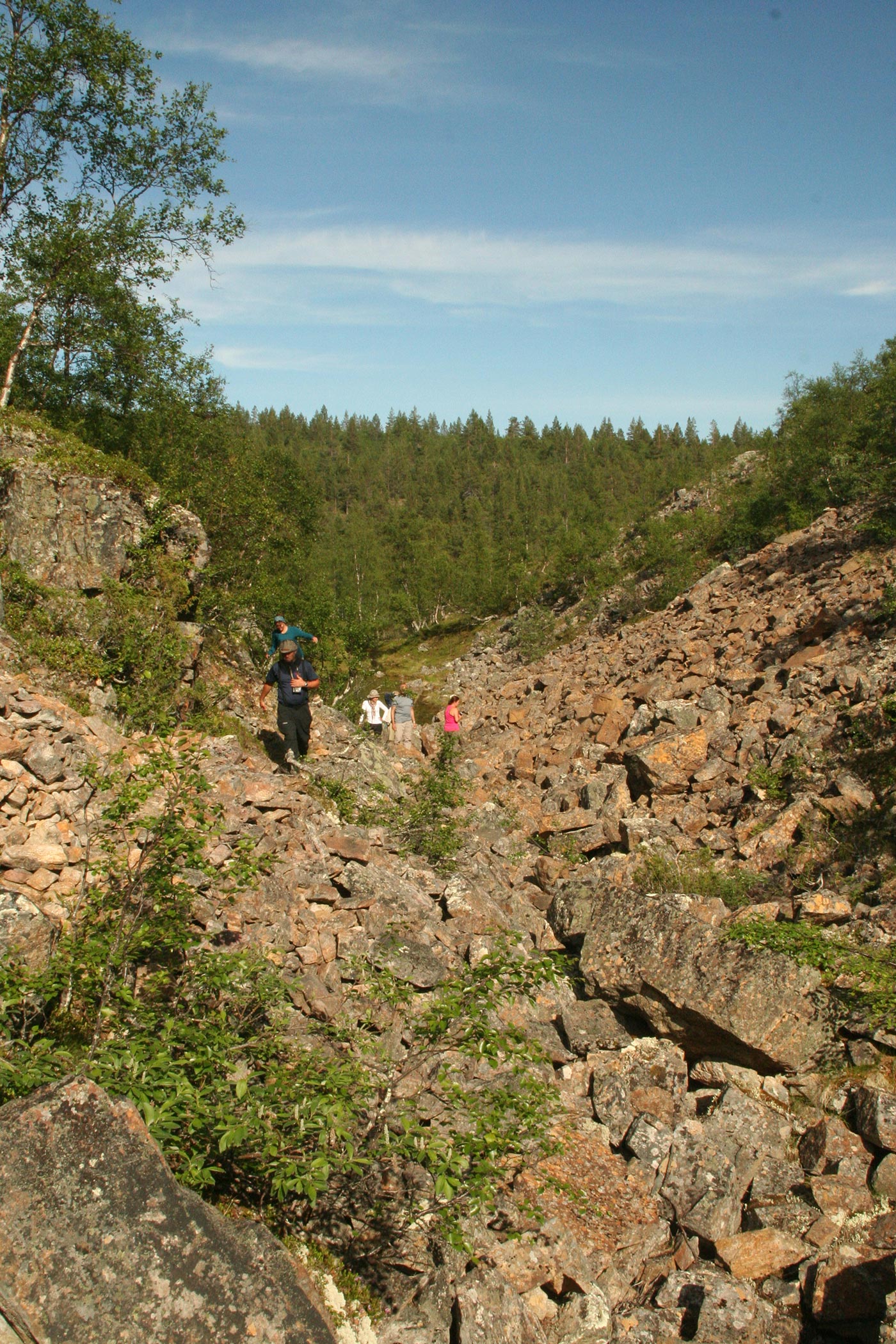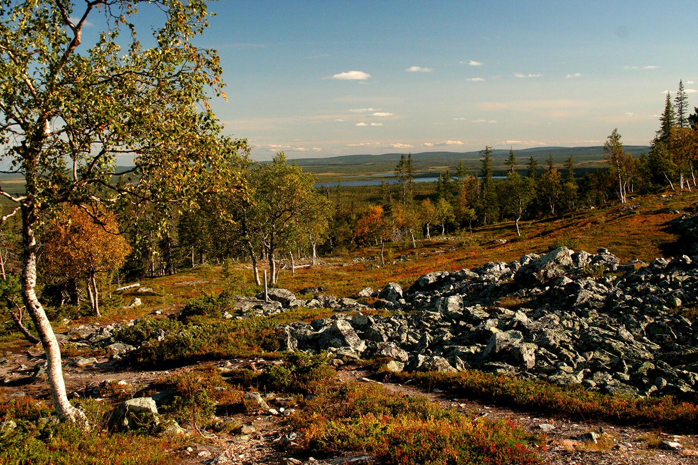 Reggel elhagyjuk a Suomu-folyó völgyét és egy kis hegyipatak mentén kapaszkodunk egyre feljebb. Lassan kiérünk a fenyvesből és göcsörtös nyírfák közt haladunk, míg egyszer csak elérjük a környező hegyvidék egyik legszebb tengerszemét. Rövid pihenő után tovább folytatjuk utunkat a hegyek felé. Lassan eltünedeznek a göcsörtös nyírfák is, és több apró tengerszemet elhagyva egyszerre kopár magashegyi tundrán lépdelünk, ahonnan gyönyörű kilátás nyílik az egész Saariselka tunturi-vidékre.
