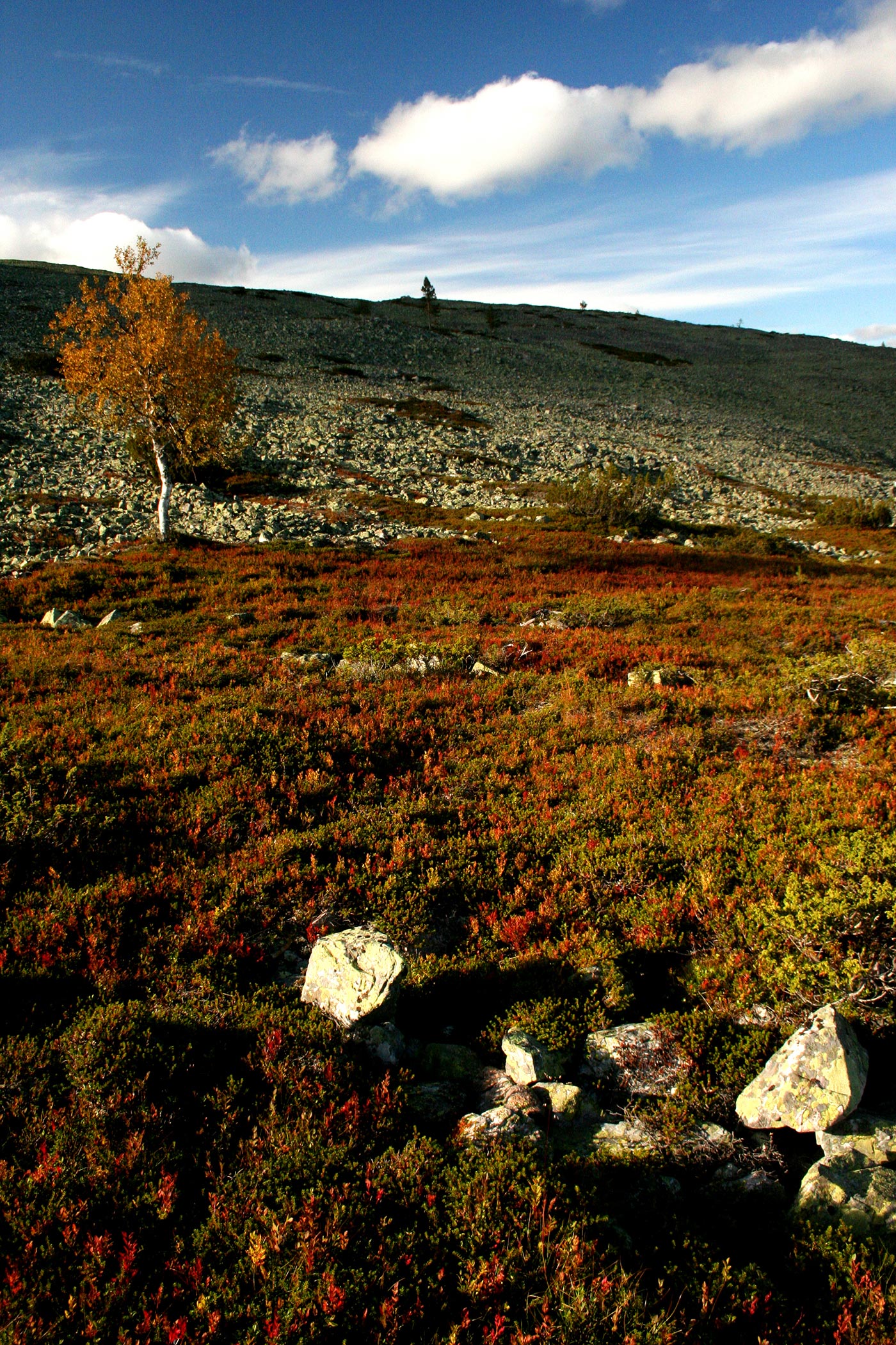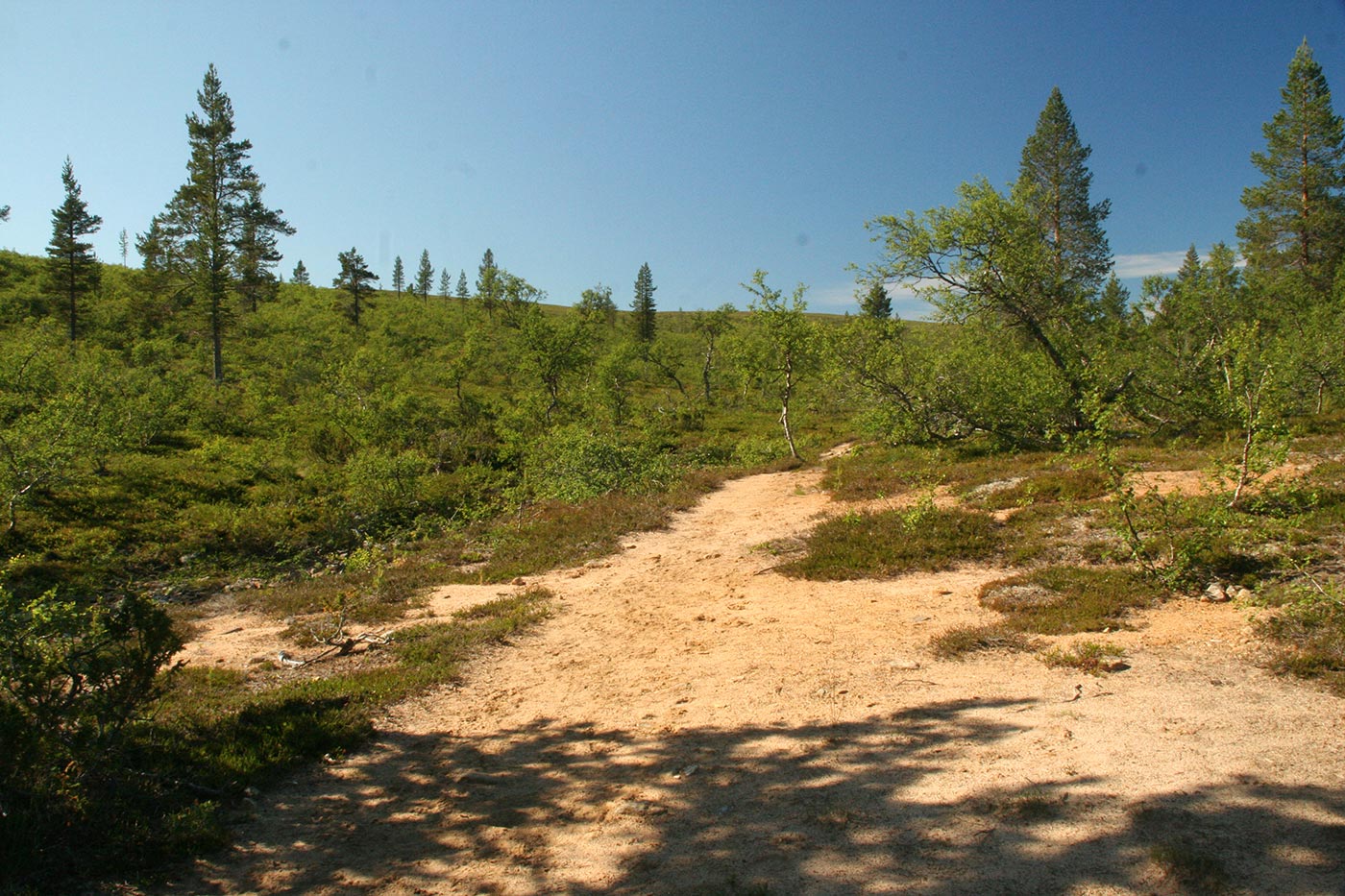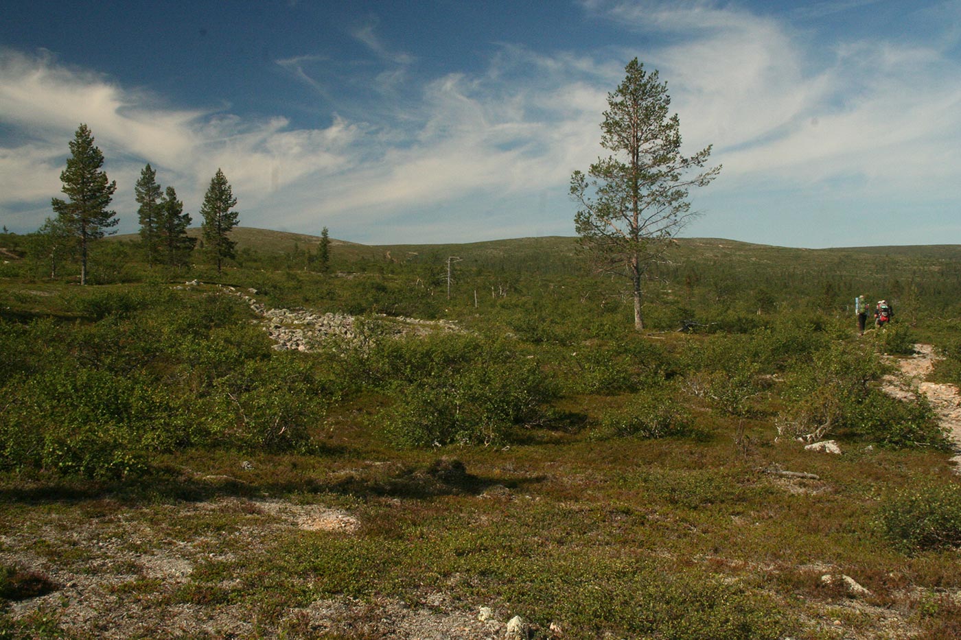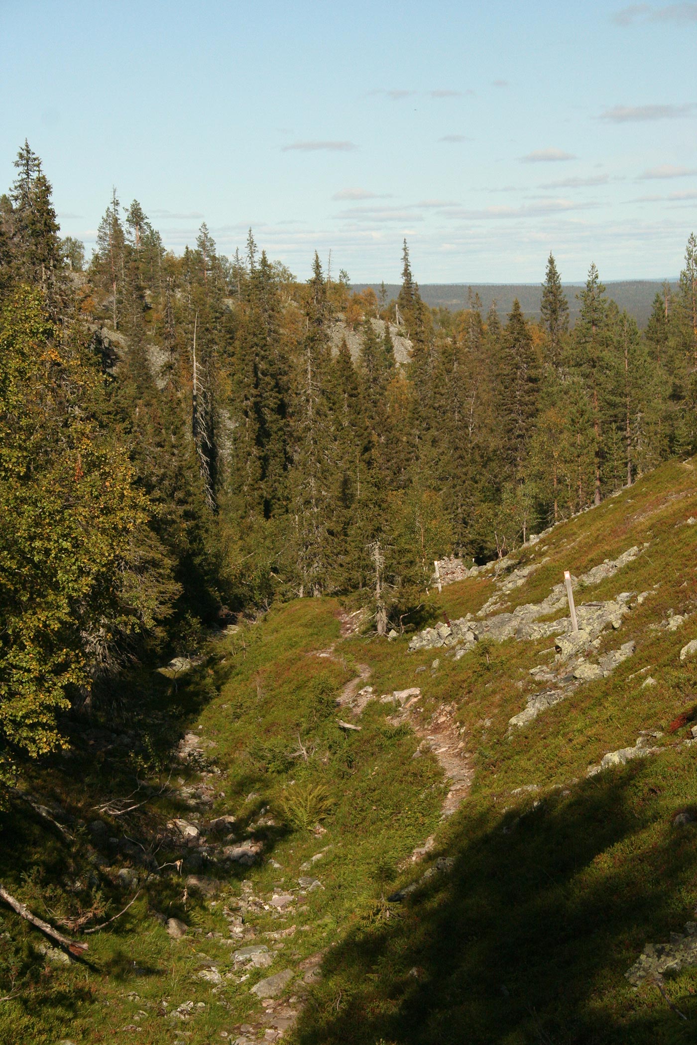Reggel elhagyjuk a Suomu-folyó völgyét és egy kis hegyipatak mentén kapaszkodunk egyre feljebb. Lassan kiérünk a fenyvesből és göcsörtös nyírfák közt haladunk, míg egyszer csak elérjük a környező hegyvidék egyik legszebb tengerszemét. Rövid pihenő után tovább folytatjuk utunkat a hegyek felé. Lassan eltünedeznek a göcsörtös nyírfák is, és több apró tengerszemet elhagyva egyszerre kopár magashegyi tundrán lépdelünk, ahonnan gyönyörű kilátás nyílik az egész Saariselka tunturi-vidékre.