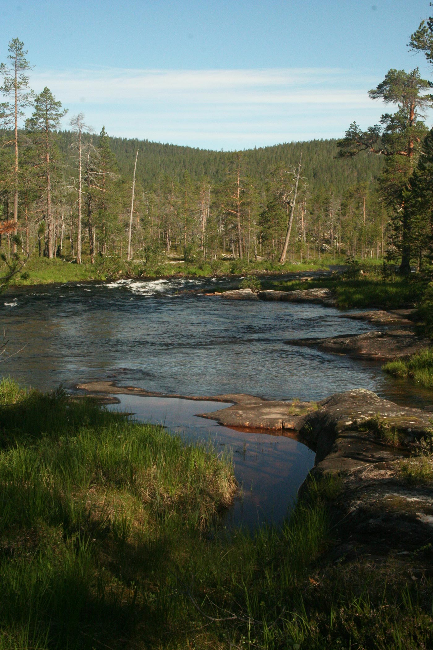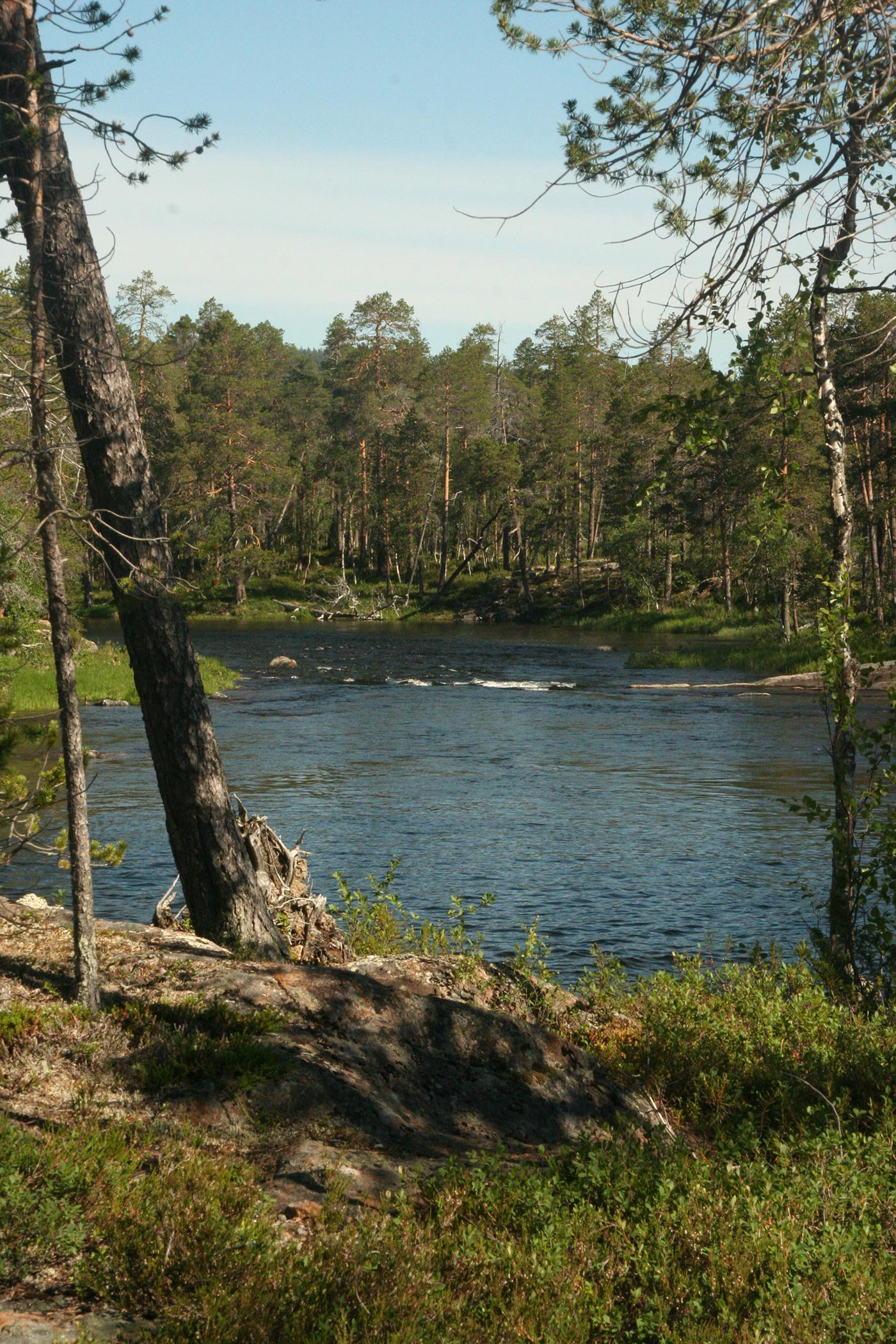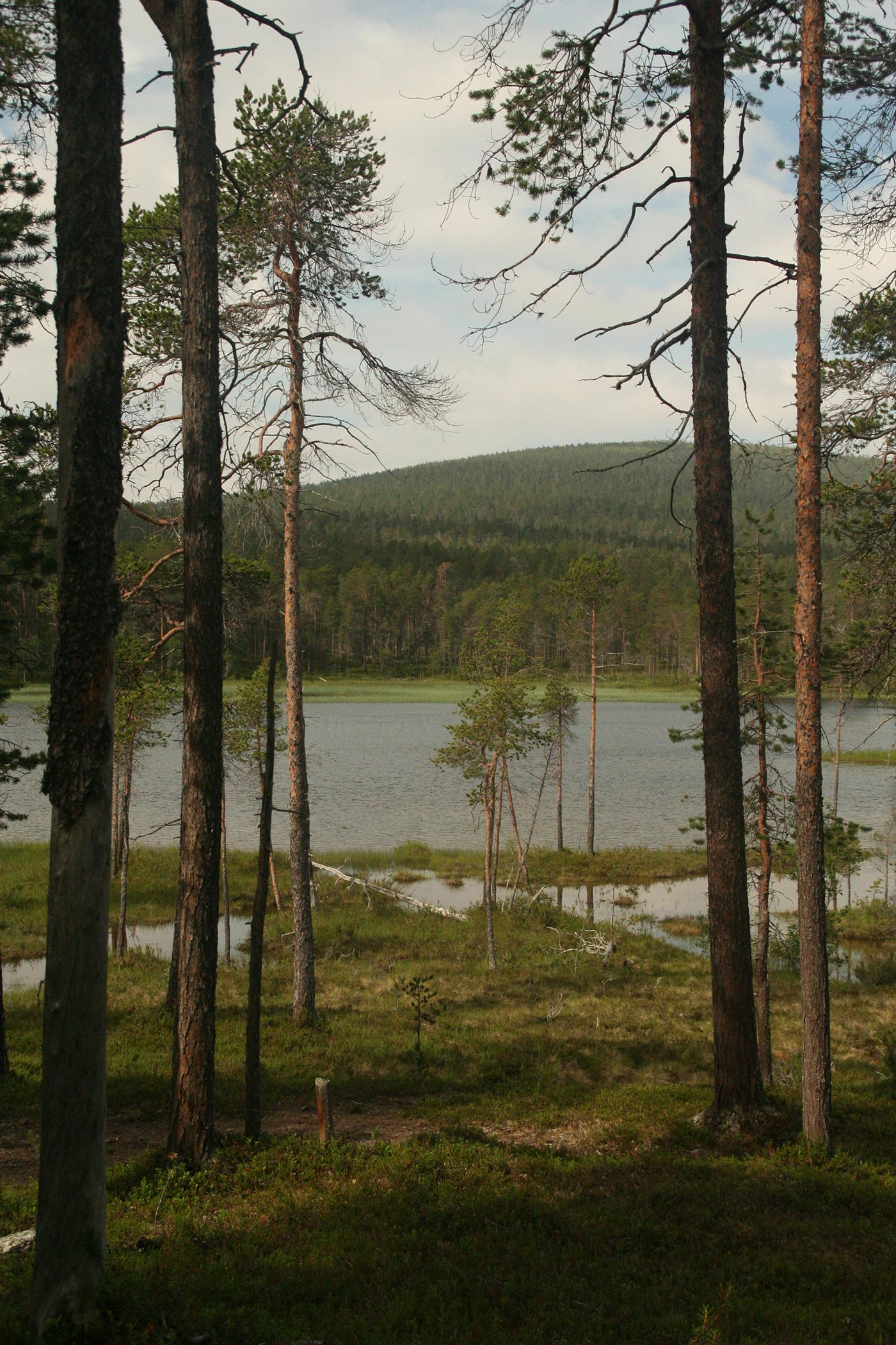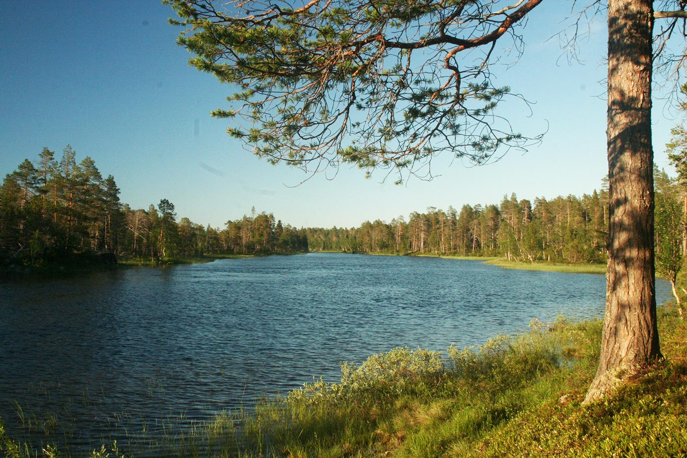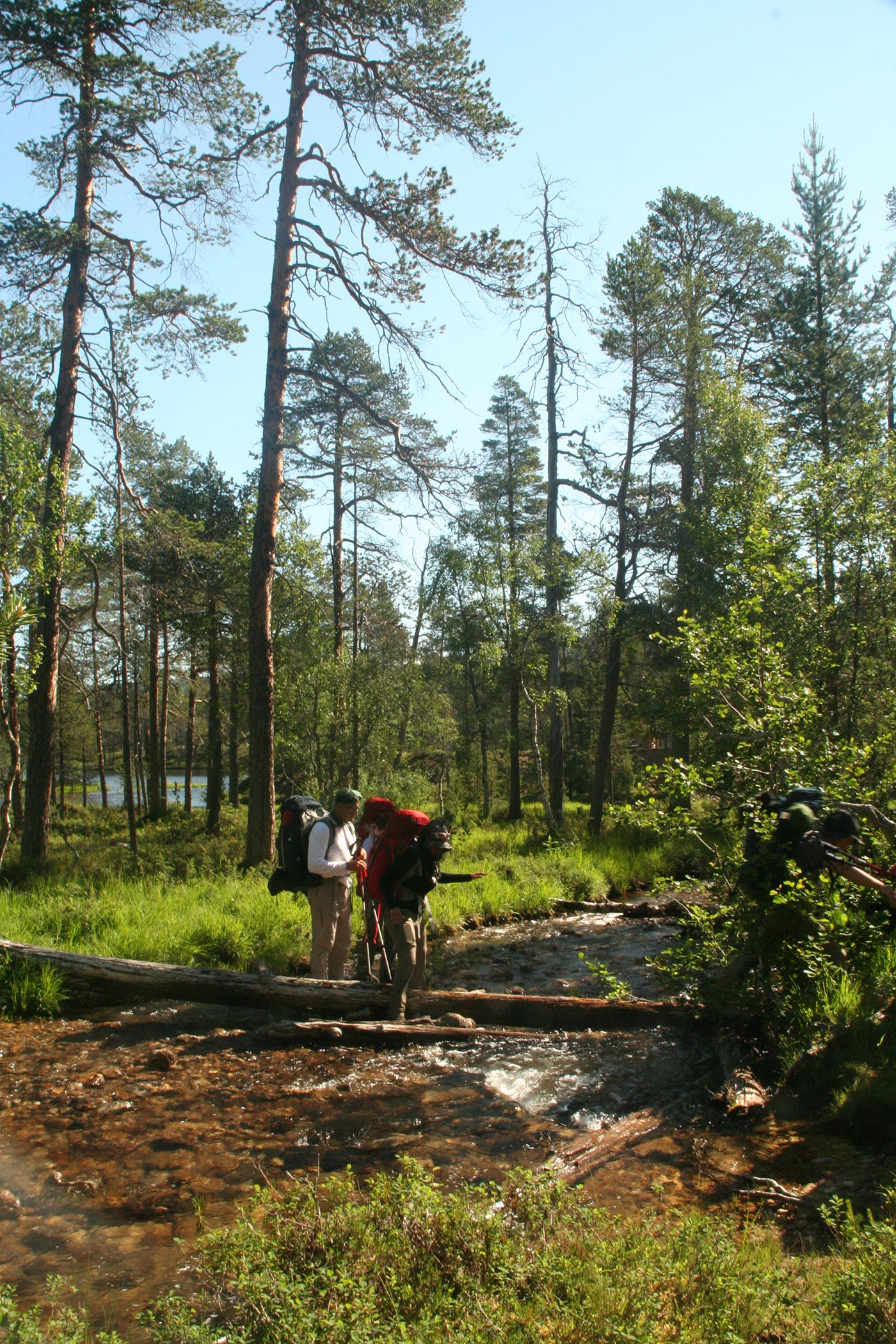 Reggel a Lutto lustán hömpölygő vizébe ömlő vad Suomu-folyó mellé szegődünk – innentől kezdve több napon át a Suomu lesz fő iránymutatónk. Egy darabig fenyvesek közt követjük a folyót, majd egy ponton – ahol a víz megszelídül – lekapjuk a bakancsot és egy gázlón a folyó túlpartjára megyünk. Innen tőzeglápokon keresztül, tavak között vezet az ösvény egy nagyobb tó partjára, ahol egy bivakház tövében tábort verünk.