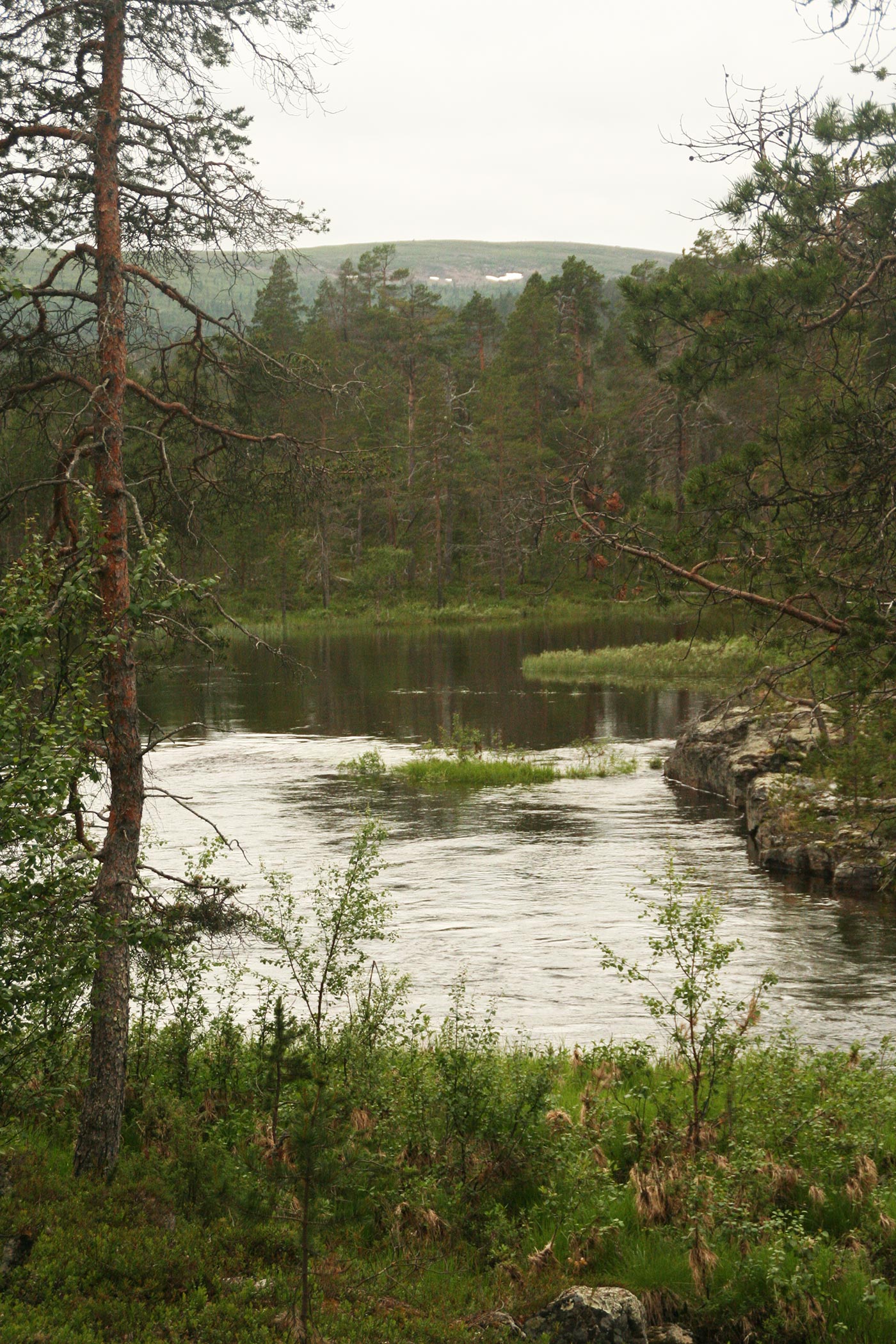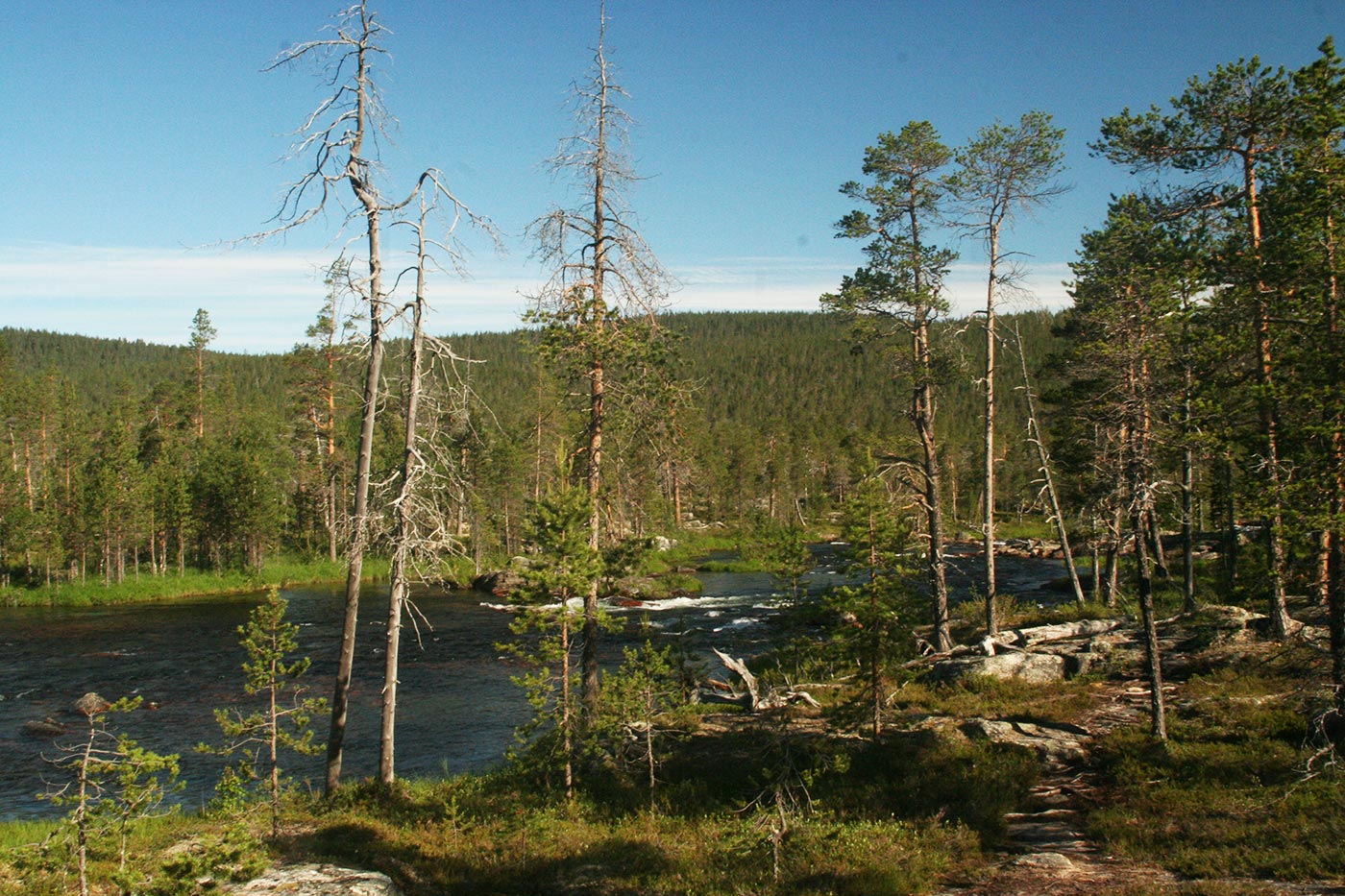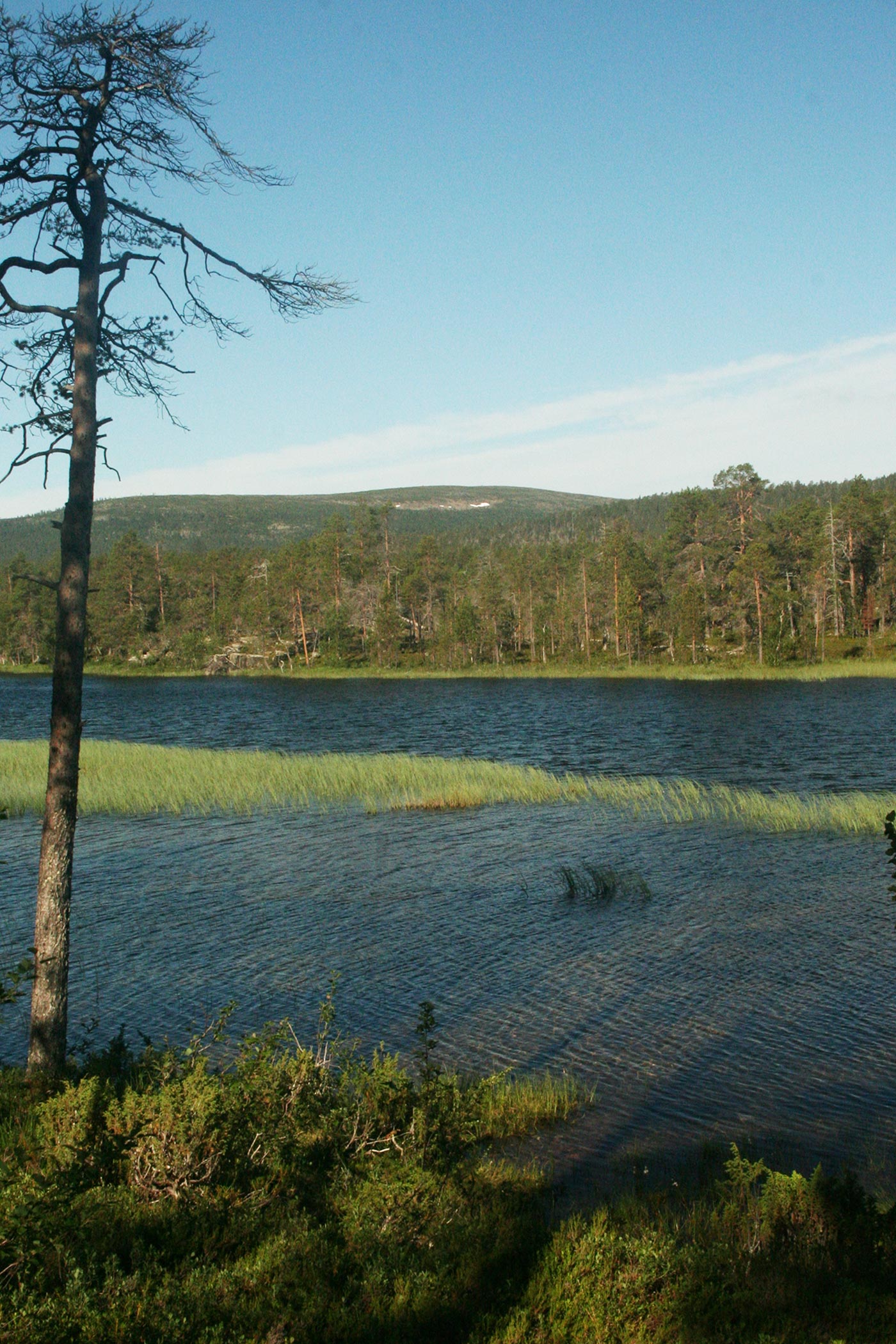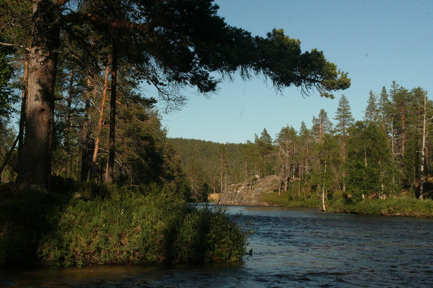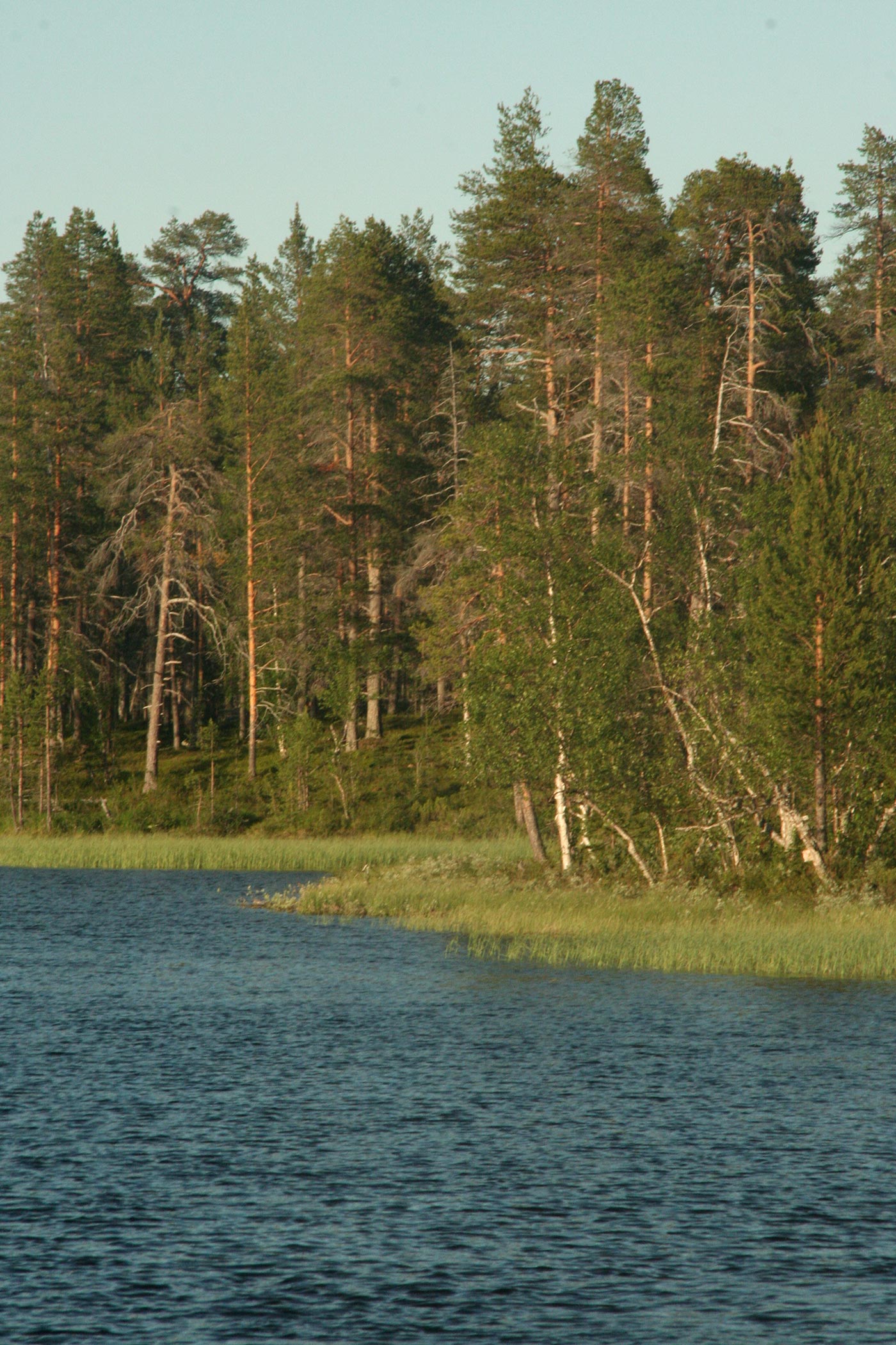 Reggel a Lutto lustán hömpölygő vizébe ömlő vad Suomu-folyó mellé szegődünk – innentől kezdve több napon át a Suomu lesz fő iránymutatónk. Egy darabig fenyvesek közt követjük a folyót, majd egy ponton – ahol a víz megszelídül – lekapjuk a bakancsot és egy gázlón a folyó túlpartjára megyünk. Innen tőzeglápokon keresztül, tavak között vezet az ösvény egy nagyobb tó partjára, ahol egy bivakház tövében tábort verünk.