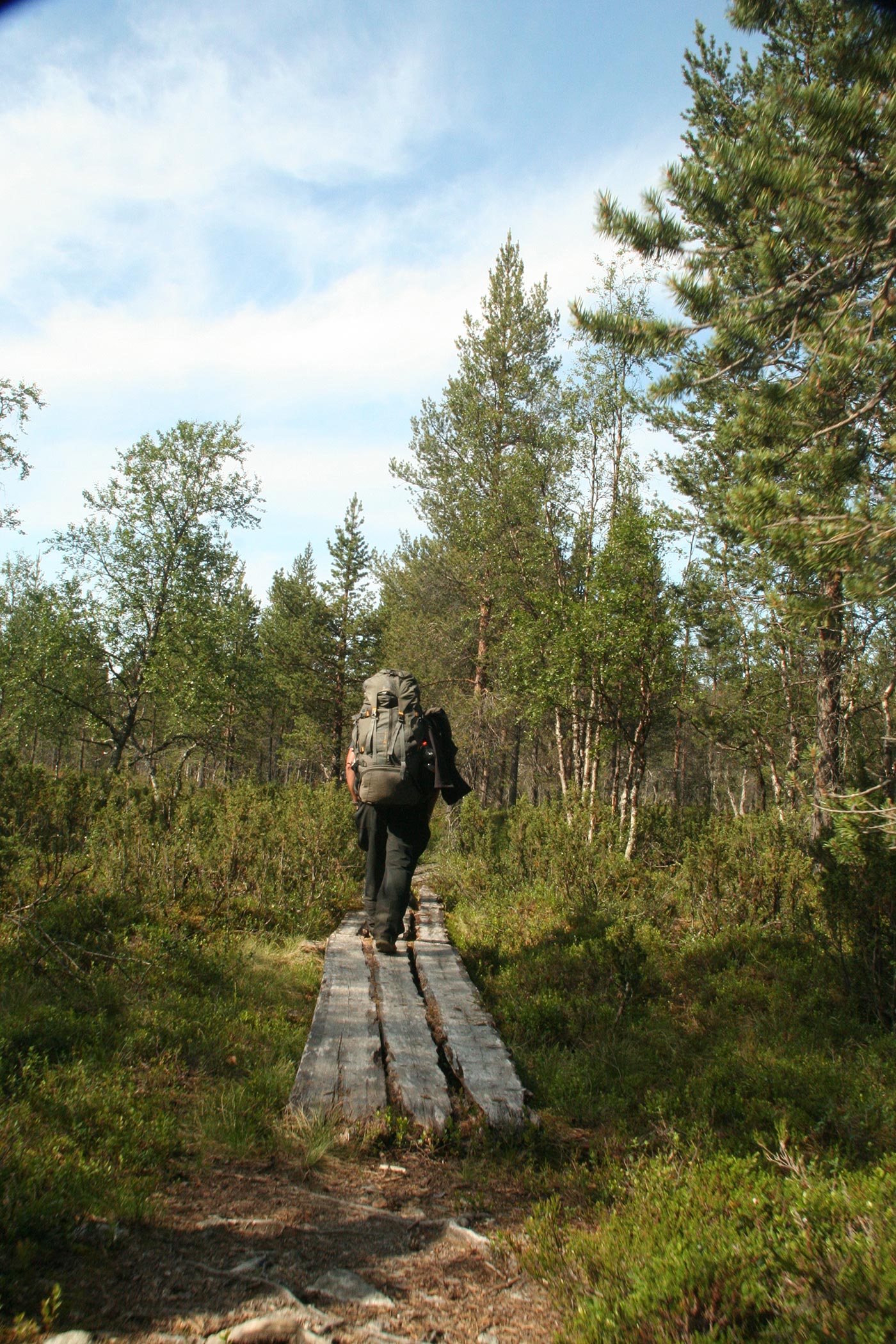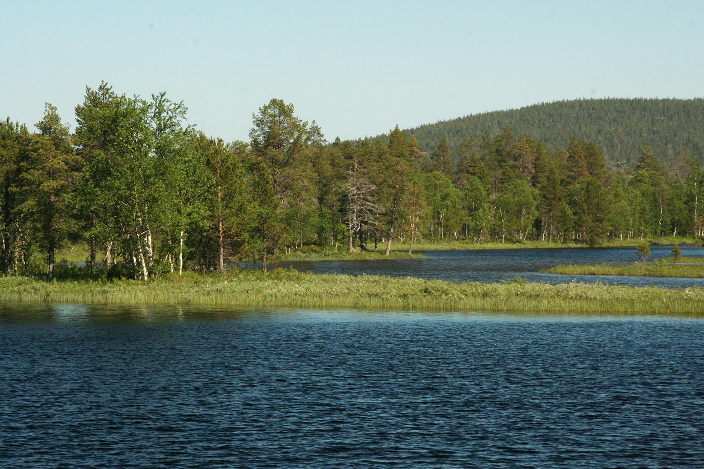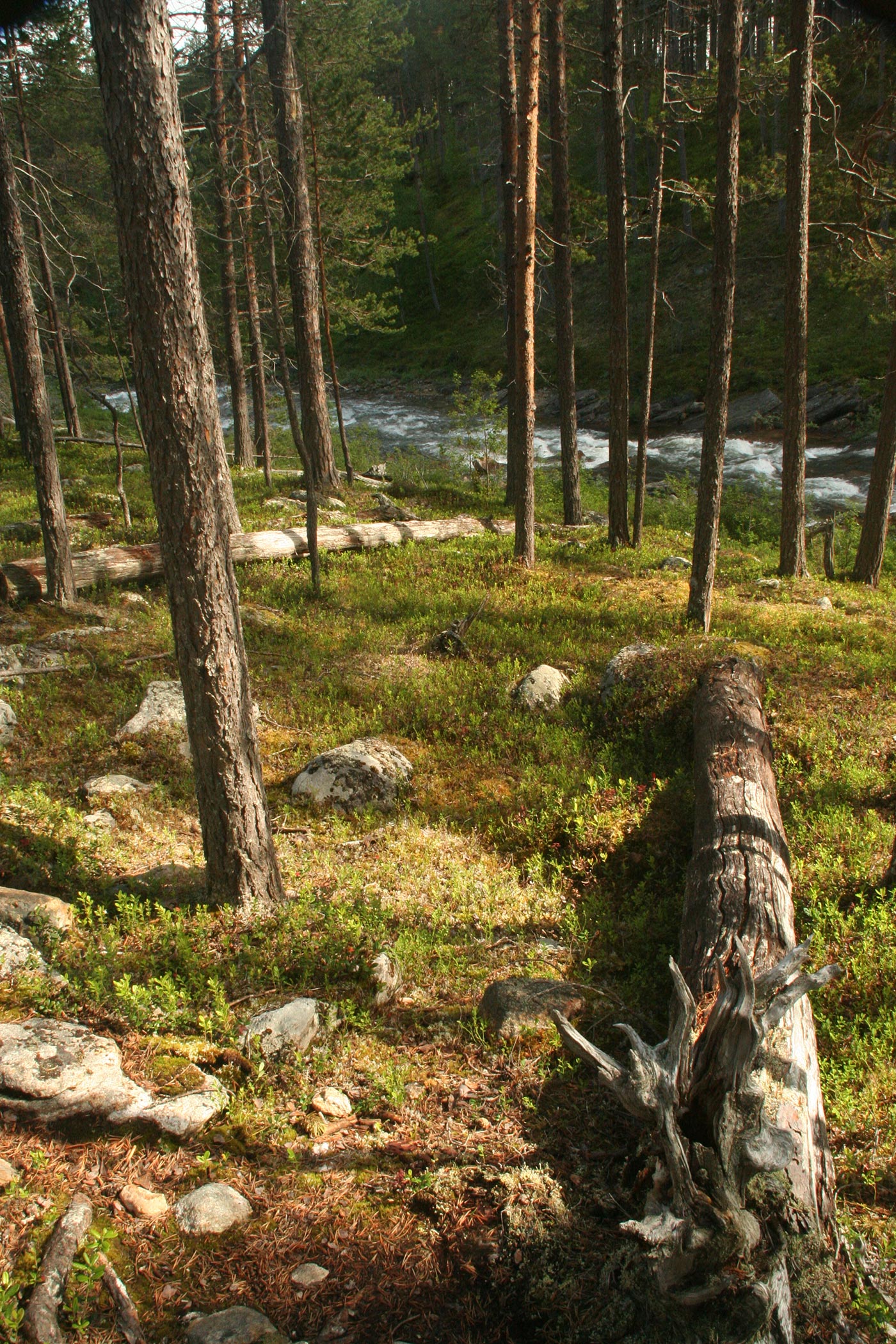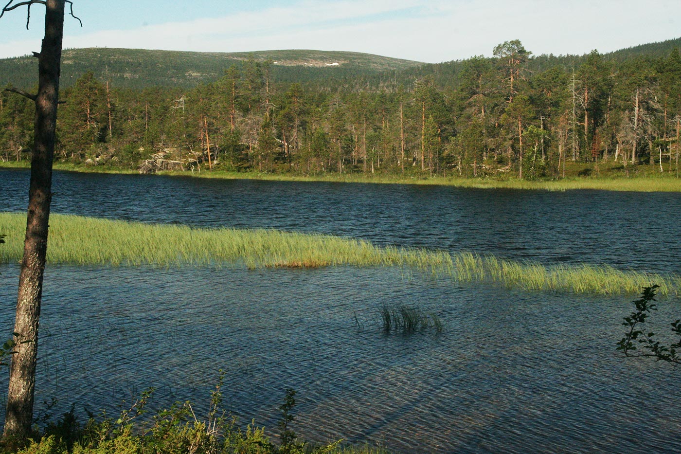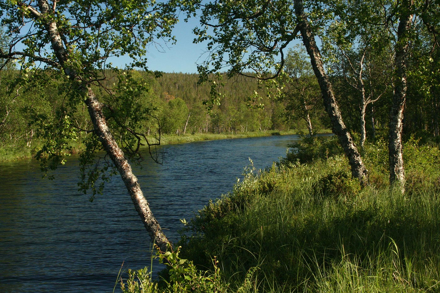 Reggel a Lutto lustán hömpölygő vizébe ömlő vad Suomu-folyó mellé szegődünk – innentől kezdve több napon át a Suomu lesz fő iránymutatónk. Egy darabig fenyvesek közt követjük a folyót, majd egy ponton – ahol a víz megszelídül – lekapjuk a bakancsot és egy gázlón a folyó túlpartjára megyünk. Innen tőzeglápokon keresztül, tavak között vezet az ösvény egy nagyobb tó partjára, ahol egy bivakház tövében tábort verünk.