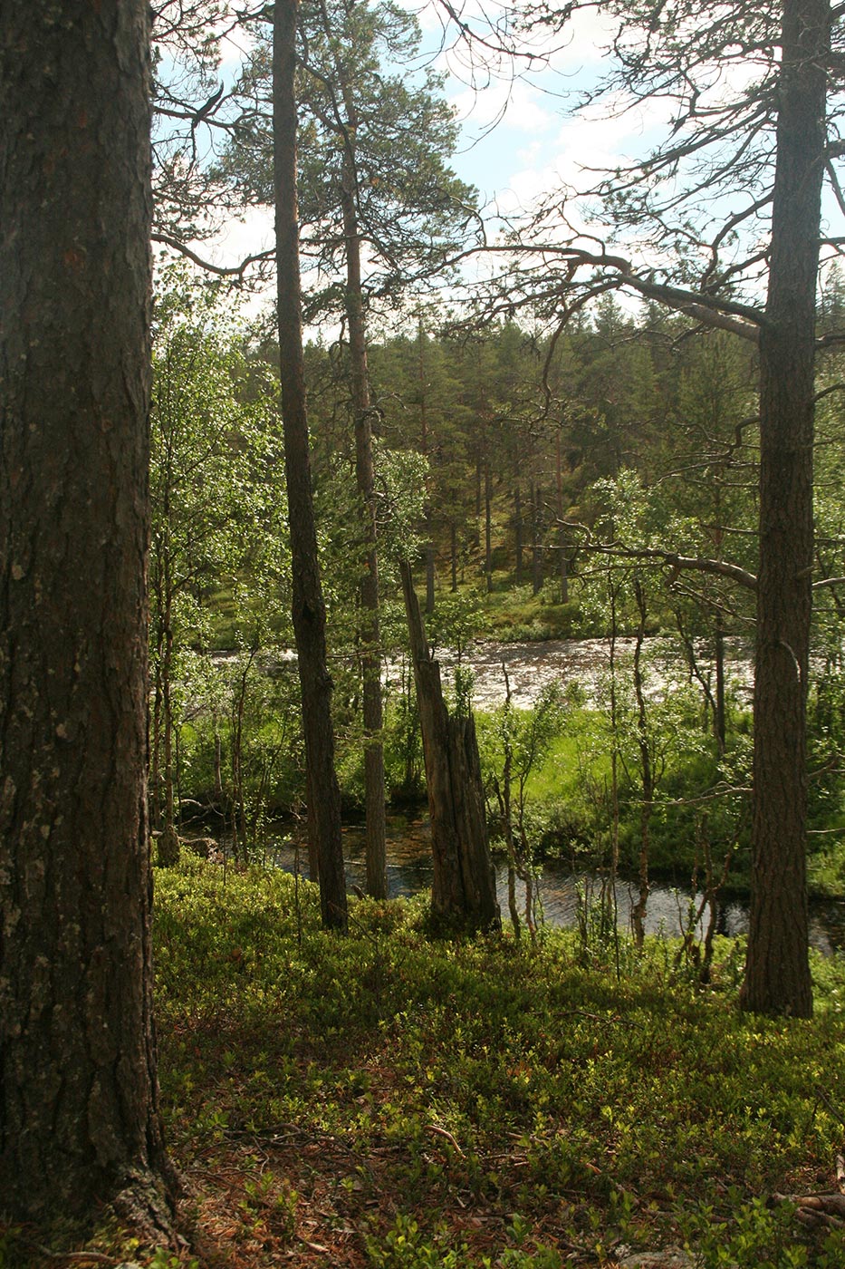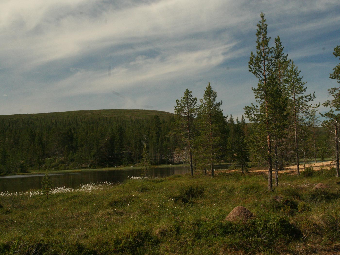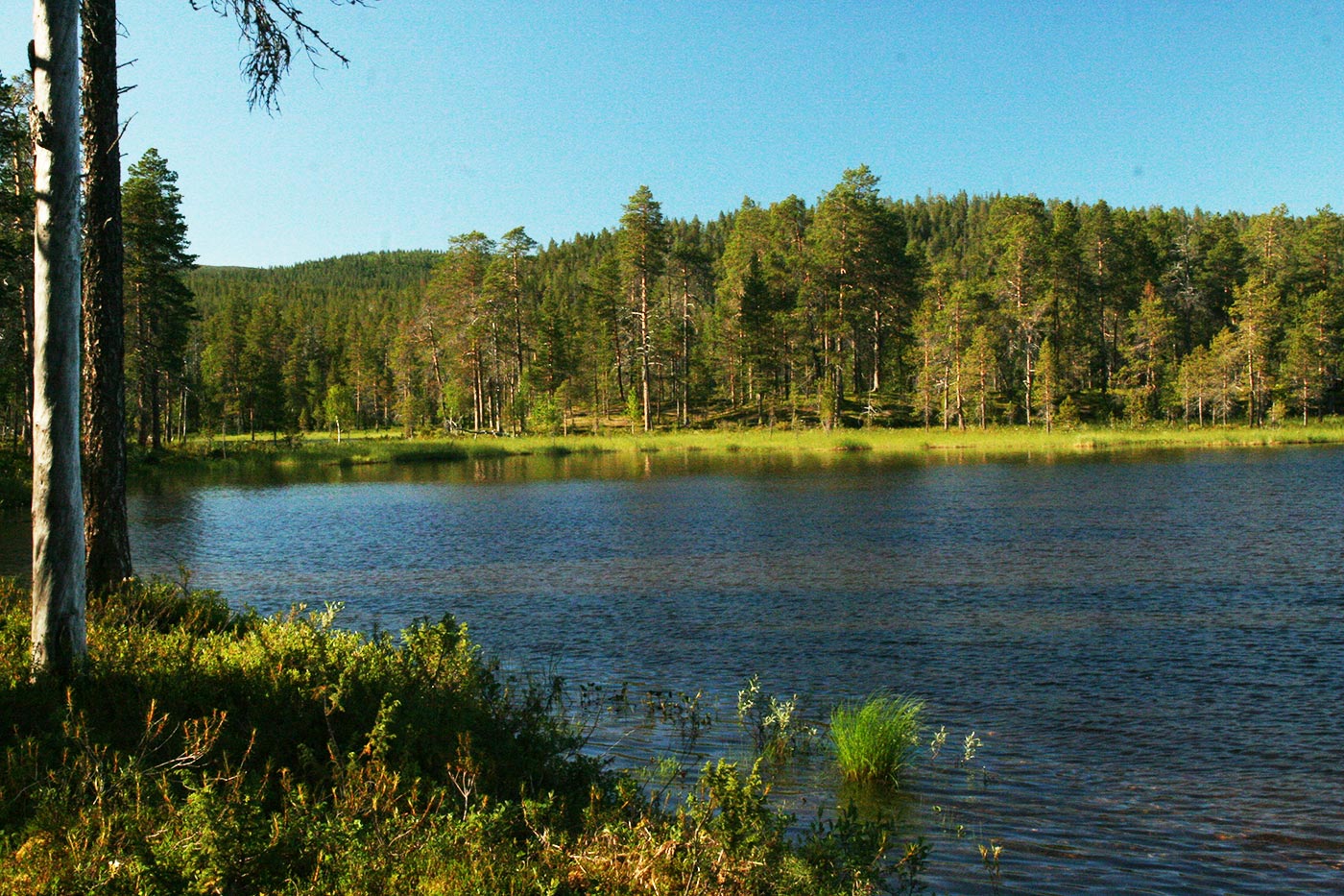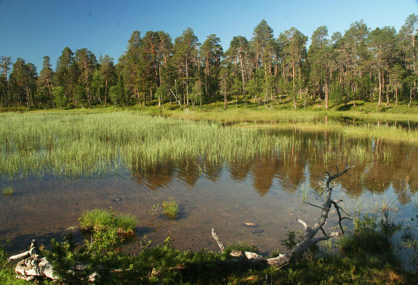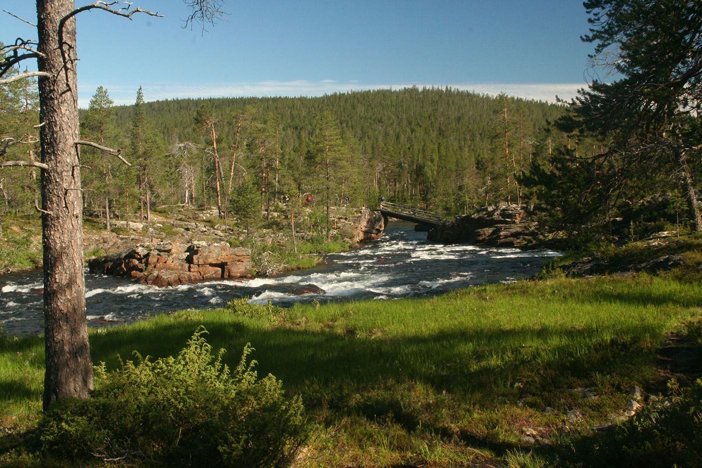 Reggel a Lutto lustán hömpölygő vizébe ömlő vad Suomu-folyó mellé szegődünk – innentől kezdve több napon át a Suomu lesz fő iránymutatónk. Egy darabig fenyvesek közt követjük a folyót, majd egy ponton – ahol a víz megszelídül – lekapjuk a bakancsot és egy gázlón a folyó túlpartjára megyünk. Innen tőzeglápokon keresztül, tavak között vezet az ösvény egy nagyobb tó partjára, ahol egy bivakház tövében tábort verünk.
